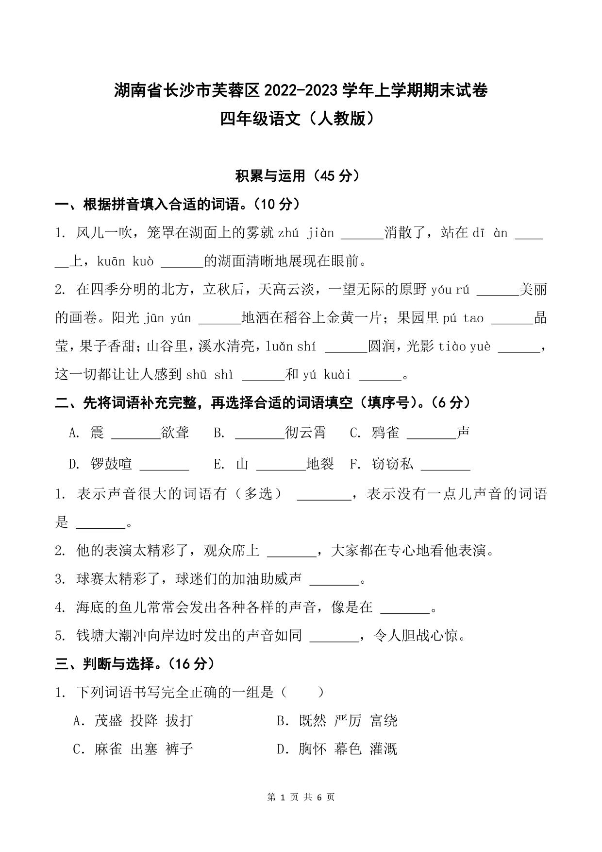 湖南省长沙市芙蓉区2022—2023学年四年级上学期期末试卷语文(人教版)