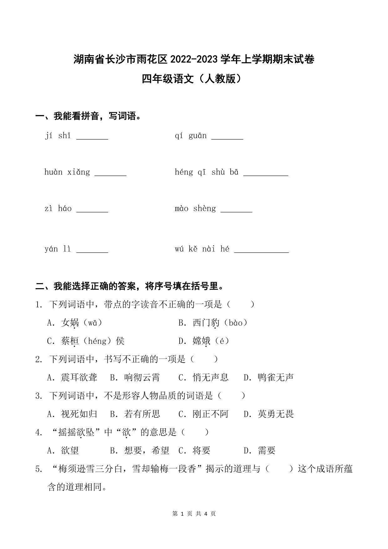 湖南省长沙市雨花区2022—2023学年上学期期末试卷四年级语文(人教版)