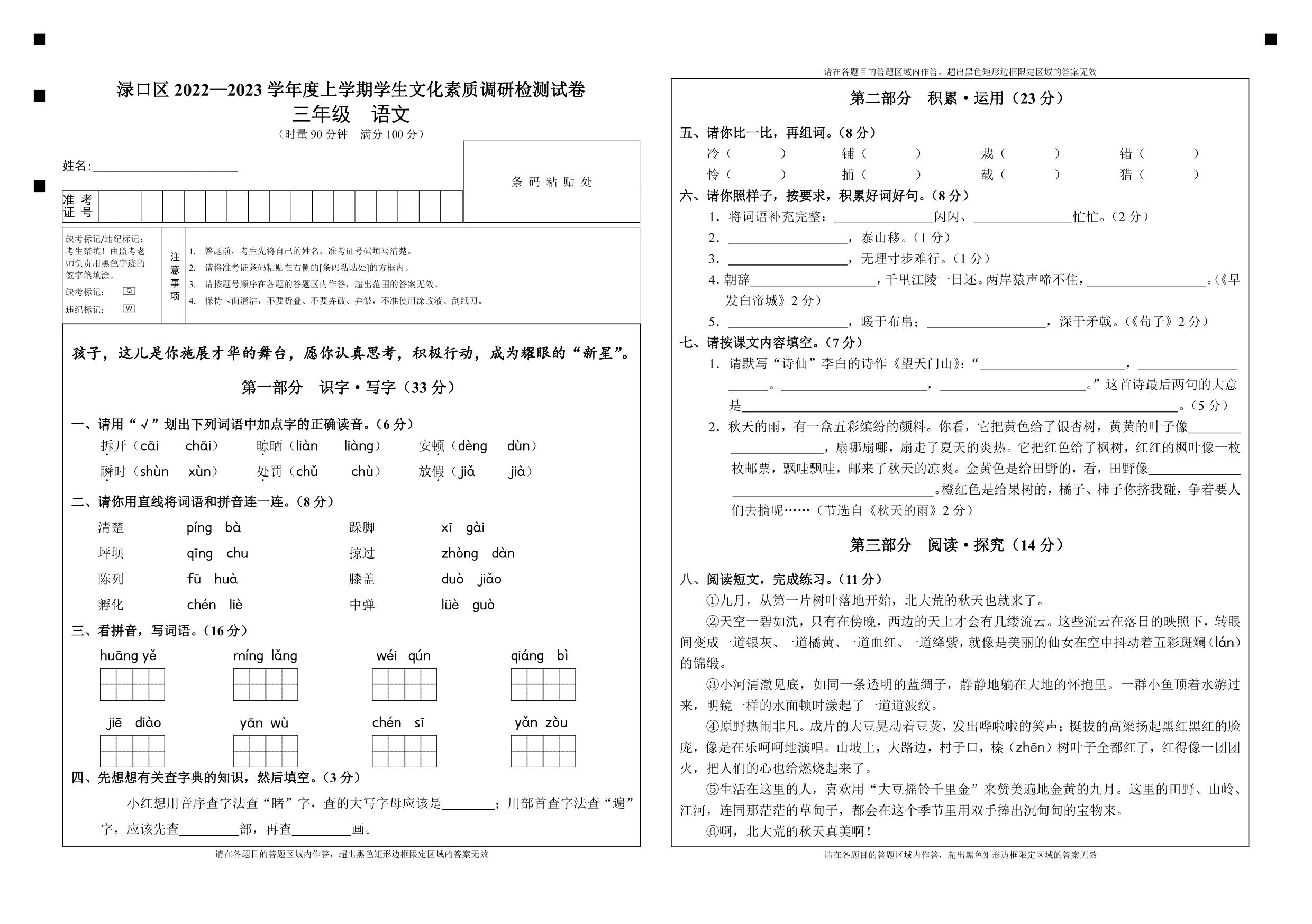 三年级语文人教版上册期末卷