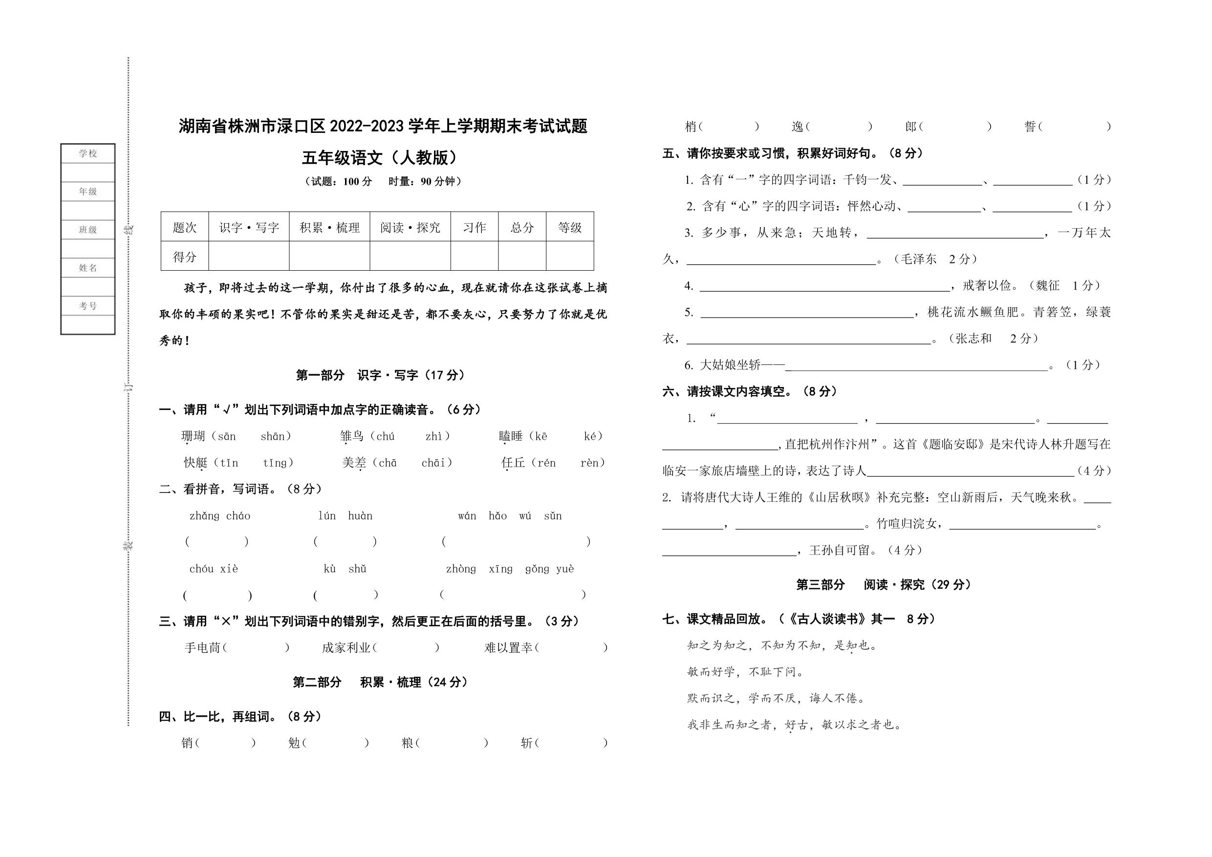 湖南省株洲市渌口区2022—2023学年上学期期末考试试题五年级语文(人教版)