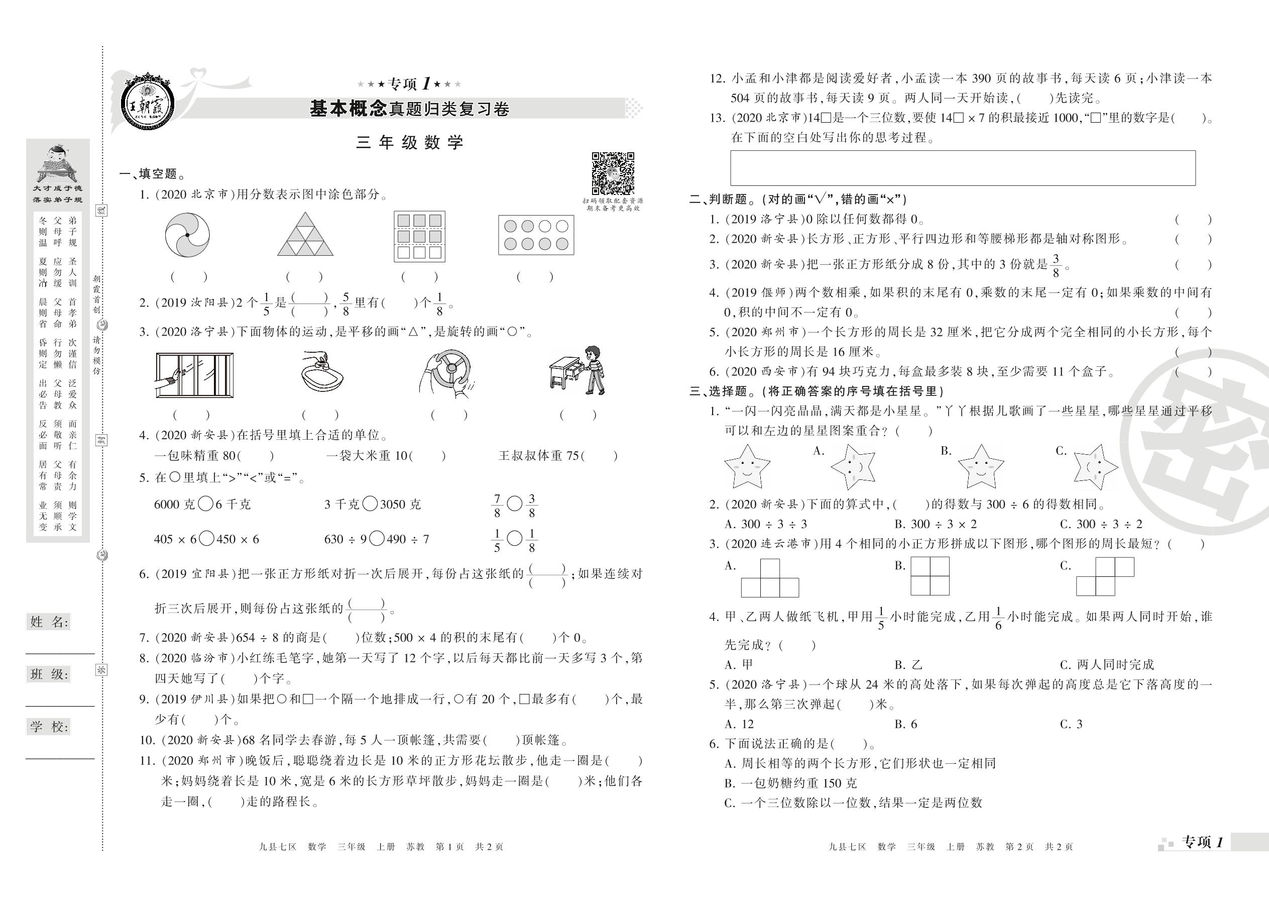 王朝霞期末专项卷——基本概念、计算真题归类复习三年级上册数学(苏教版)_R21080492303【0】