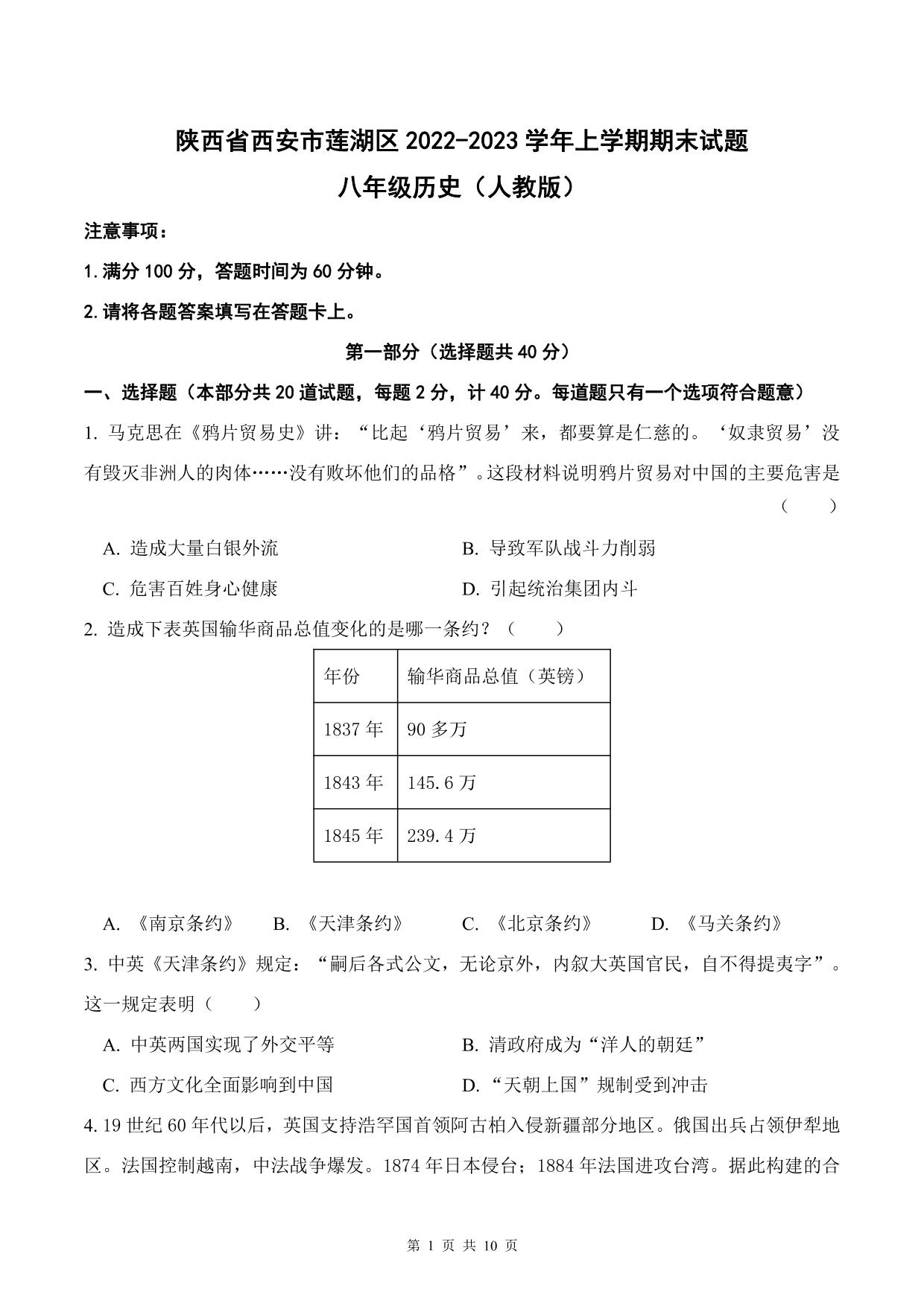 陕西省西安市莲湖区2022—2023学年上学期期末试题八年级历史(人教版)