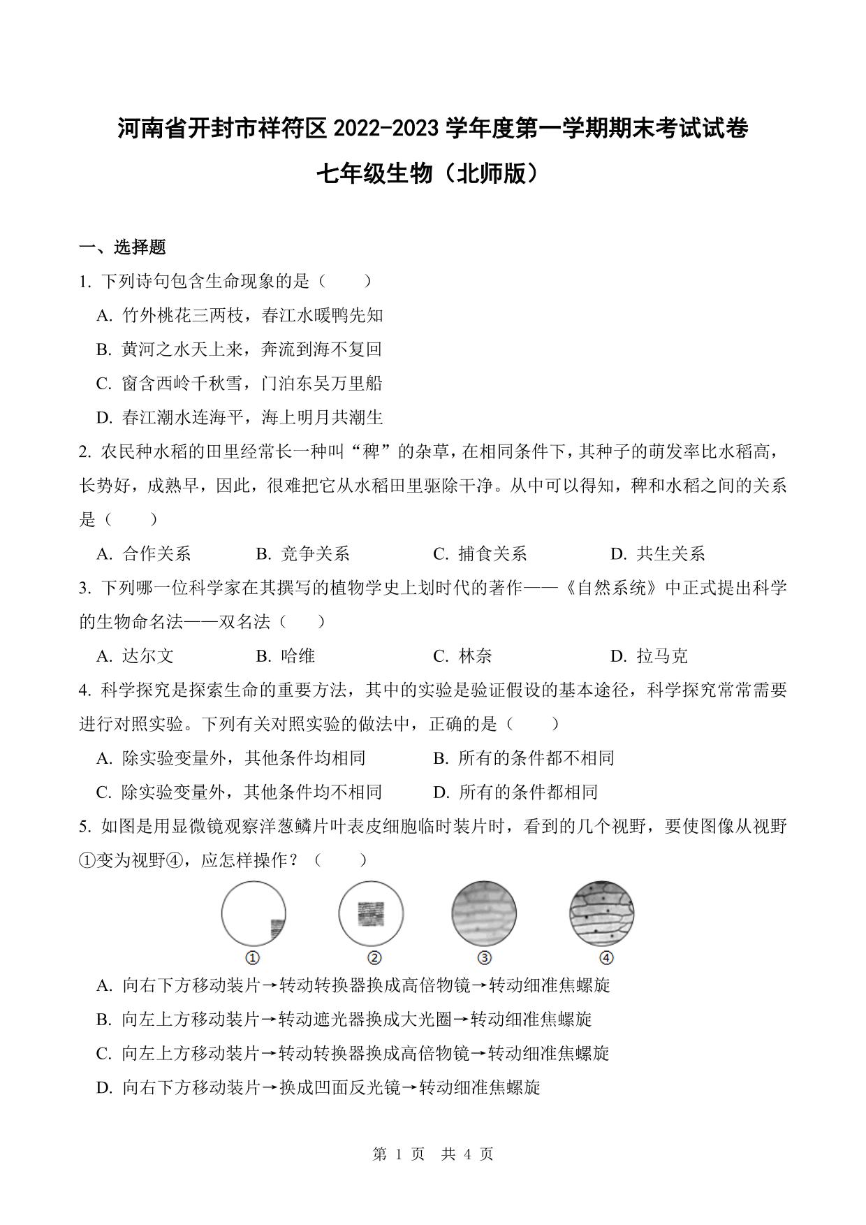 河南省开封市祥符区2022-2023学年度第一学期期末考试试卷七年级生物(北师版)