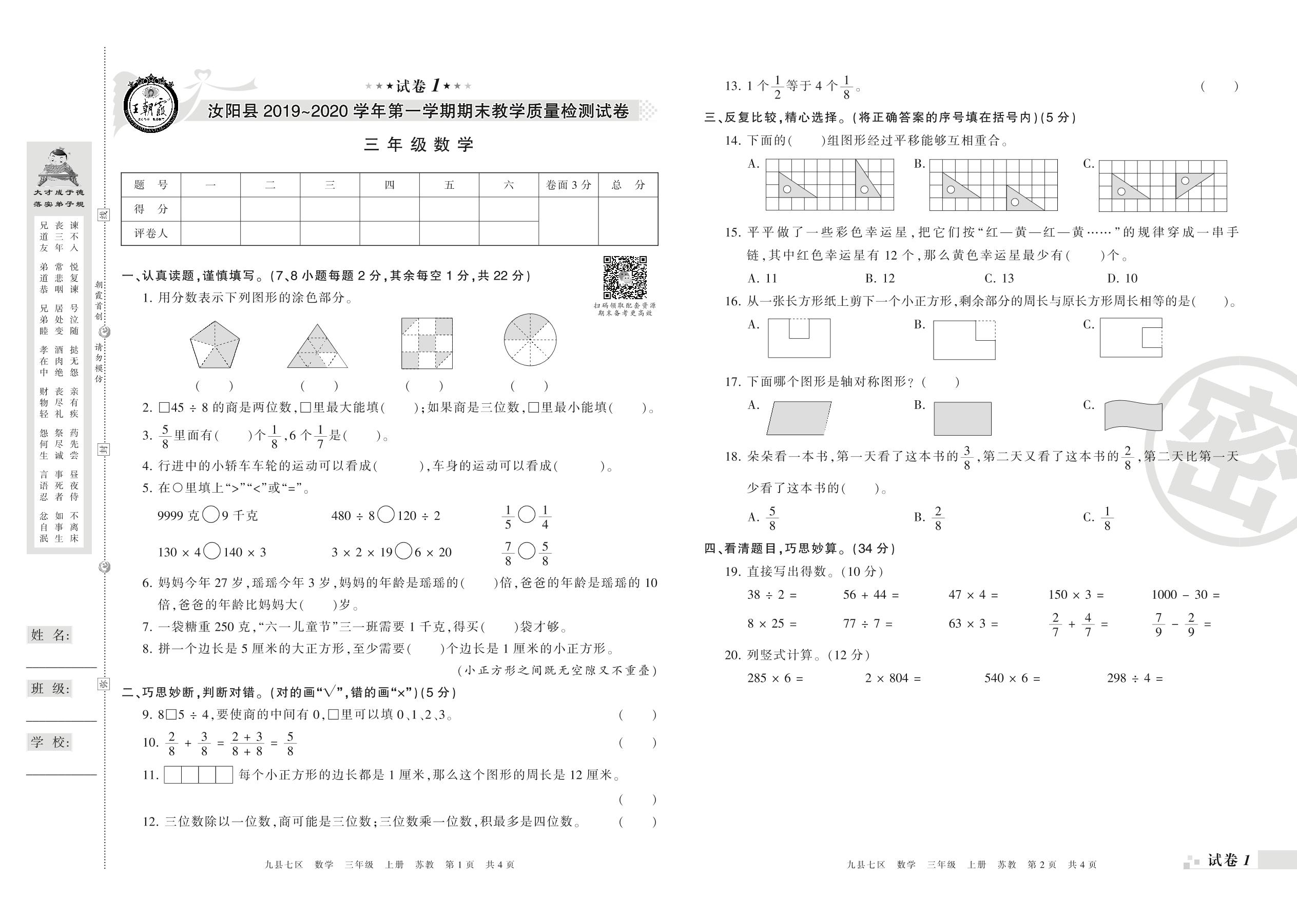 2019-2020学年第一学期洛阳市汝阳县三年级数学试卷(苏教版)【1】