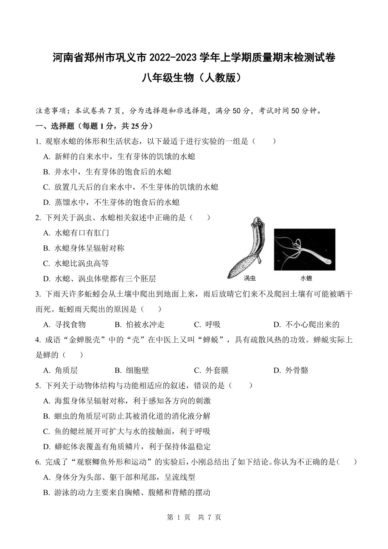 河南省郑州市巩义市2022-2023学年上学期质量期末检测试卷八年级生物(人教版)
