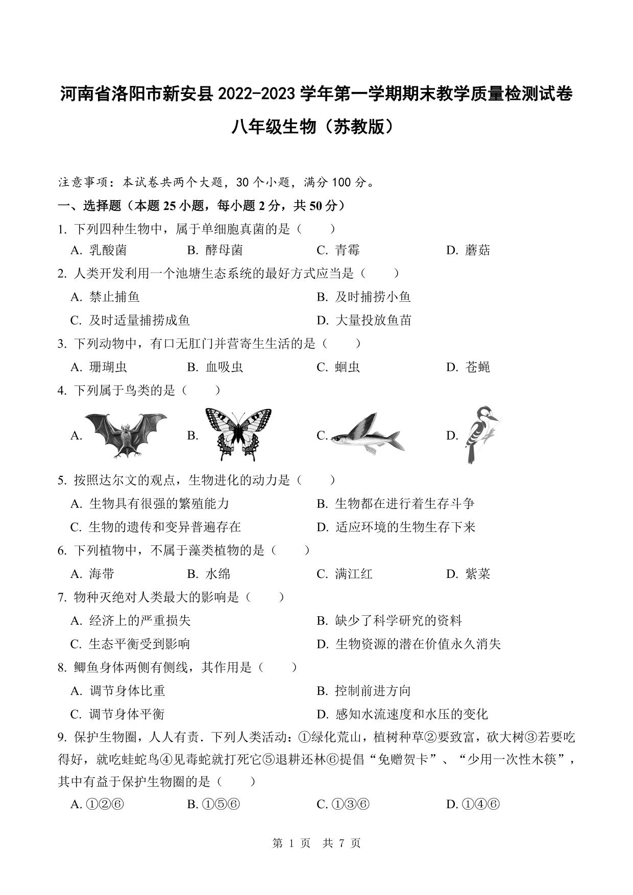 河南省洛阳市新安县2022-2023学年第一学期期末教学质量检测试卷八年级生物(苏教版)