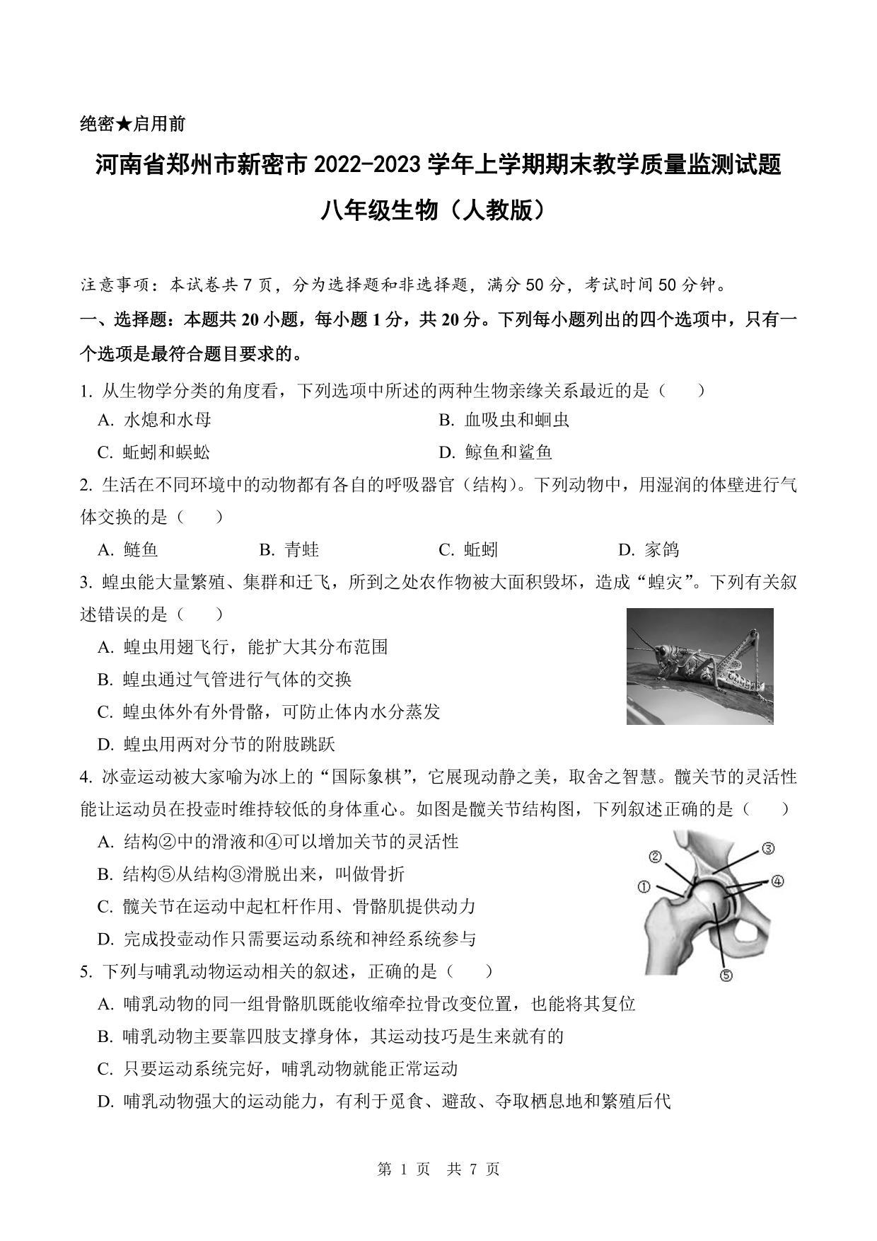 河南省郑州市新密市2022-2023学年上学期期末教学质量监测试题八年级生物(人教版)