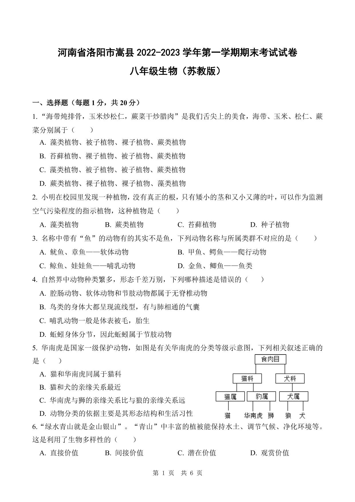 河南省洛阳市嵩县2022-2023学年第一学期期末考试试卷八年级生物(苏教版)