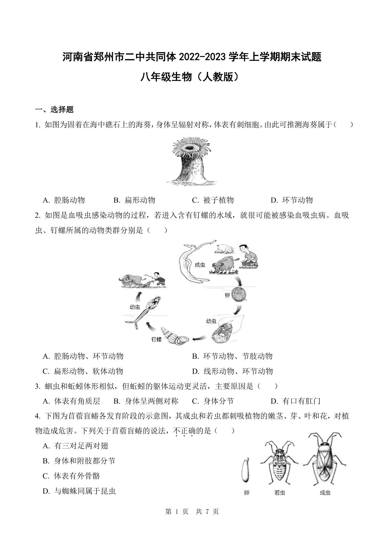 河南省郑州市二中共同体2022-2023学年上学期期末试题八年级生物(人教版)