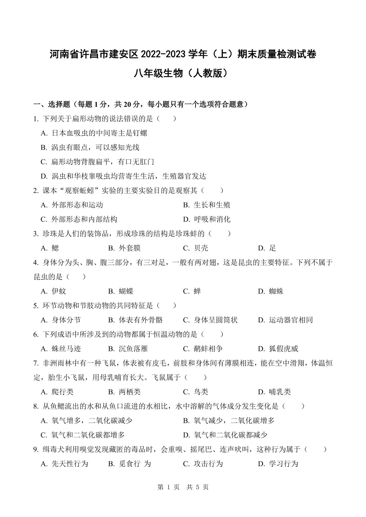 河南省许昌市建安区2022-2023学年(上)期末质量检测试卷八年级生物(人教版)