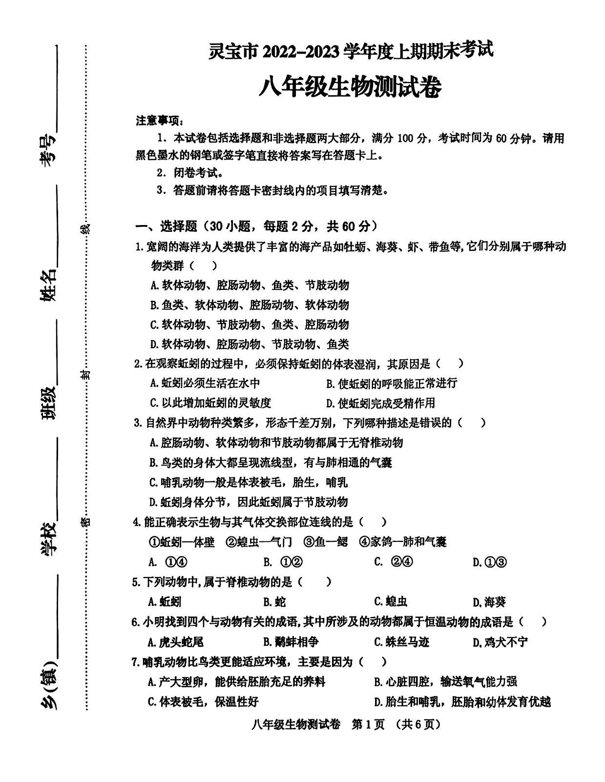 河南省三门峡市灵宝市2022-2023学年度上学期期末考试测试卷八年级生物(人教版)
