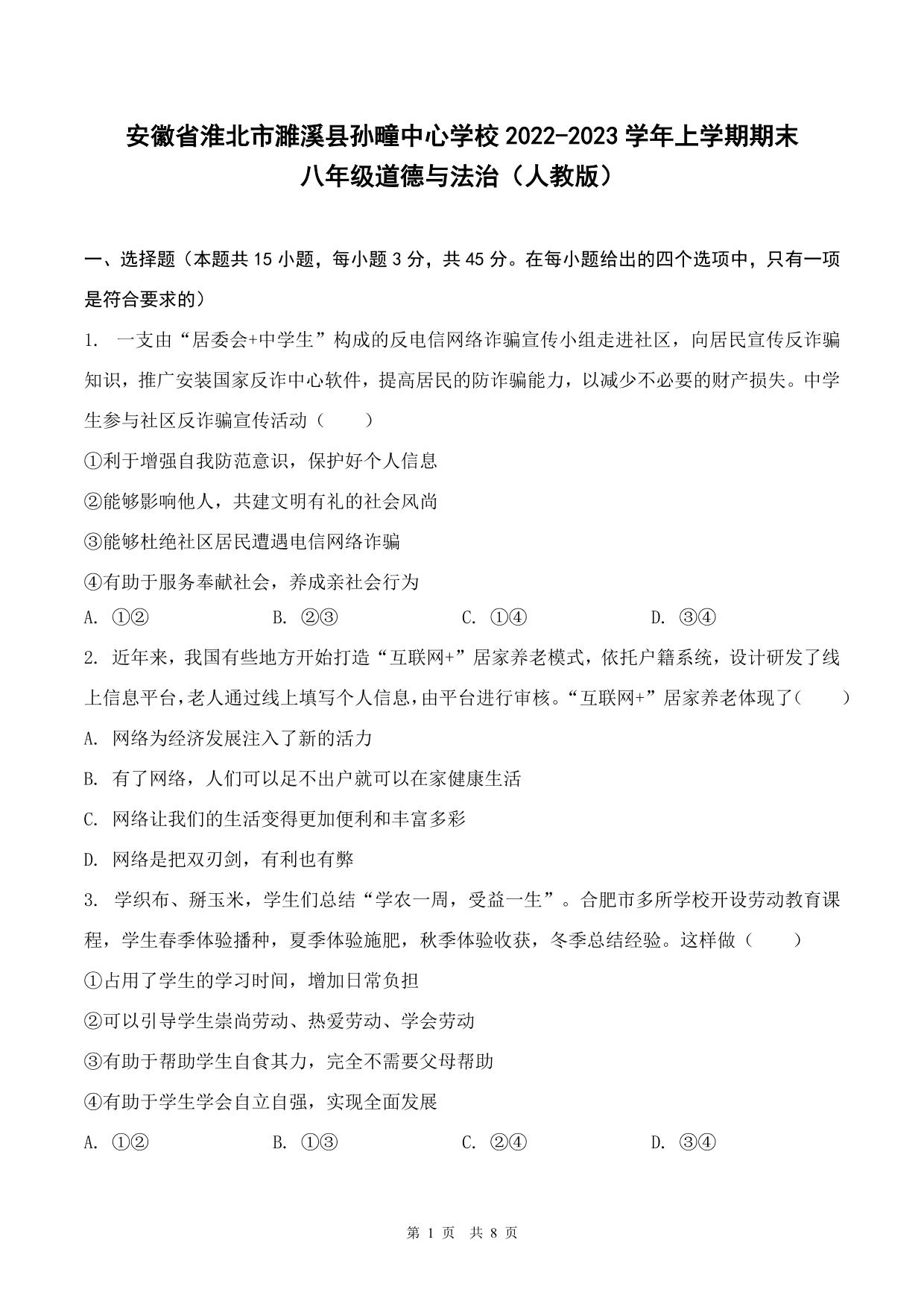 安徽省淮北市濉溪县孙疃中心学校2022-2023学年上学期期末八年级道德与法治(人教版)