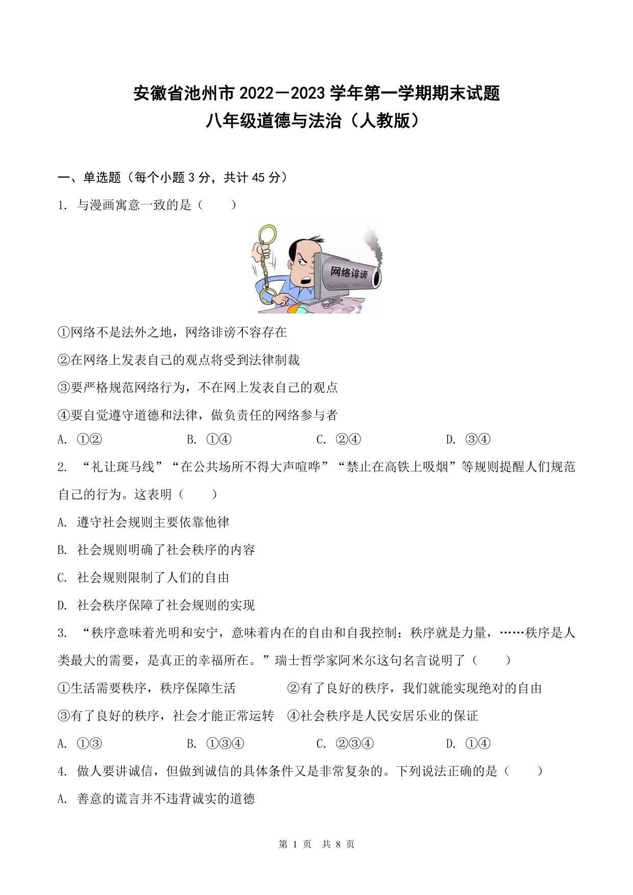 安徽省池州市2022-2023学年第一学期期末试题八年级道德与法治(人教版)