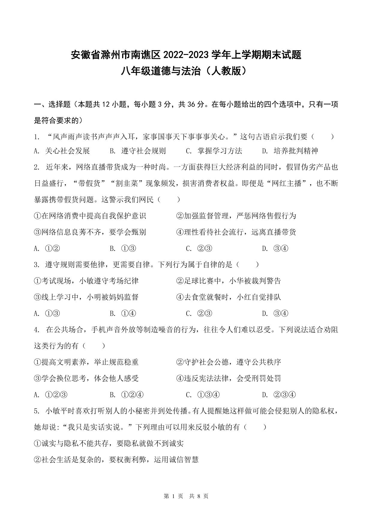 安徽省滁州市南谯区2022-2023学年上学期期末试题八年级道德与法治(人教版)
