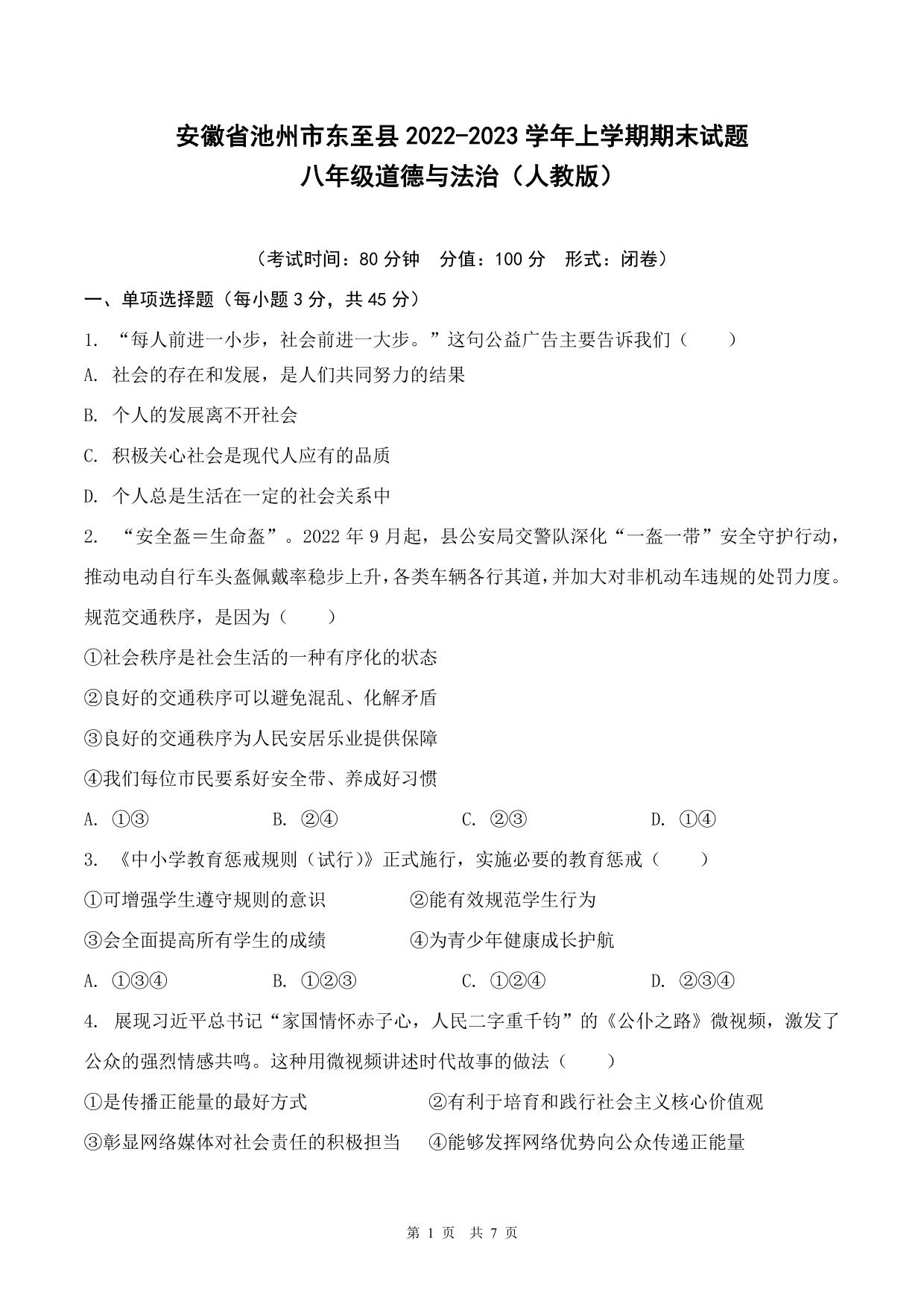 安徽省池州市东至县2022-2023学年上学期期末试题八年级道德与法治(人教版)