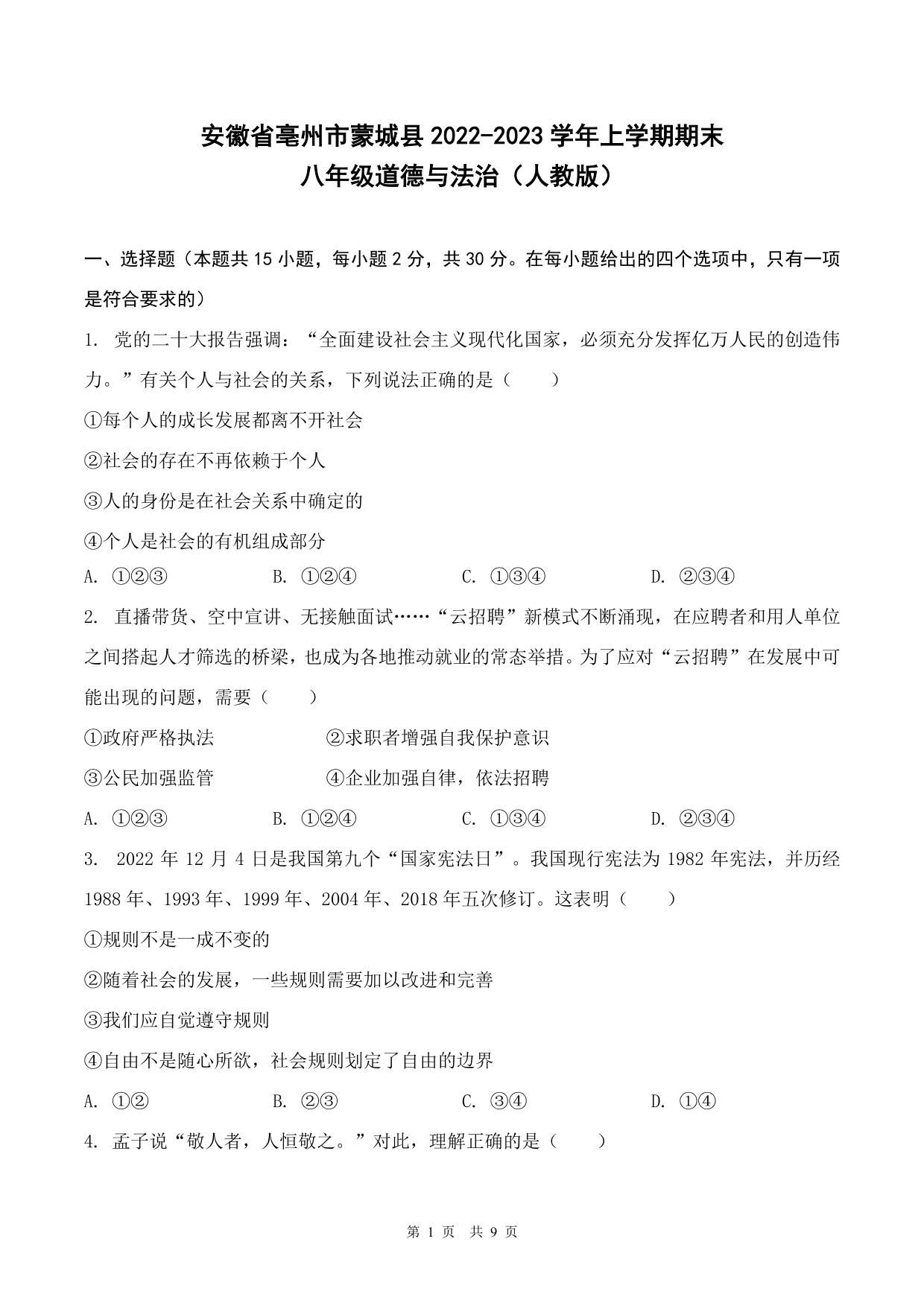 安徽省亳州市蒙城县2022-2023学年上学期期末八年级道德与法治(人教版)