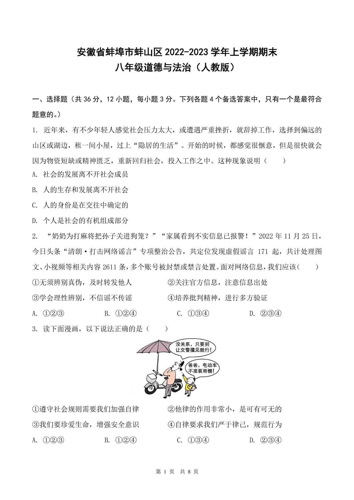 安徽省蚌埠市蚌山区2022-2023学年上学期期末八年级道德与法治(人教版)