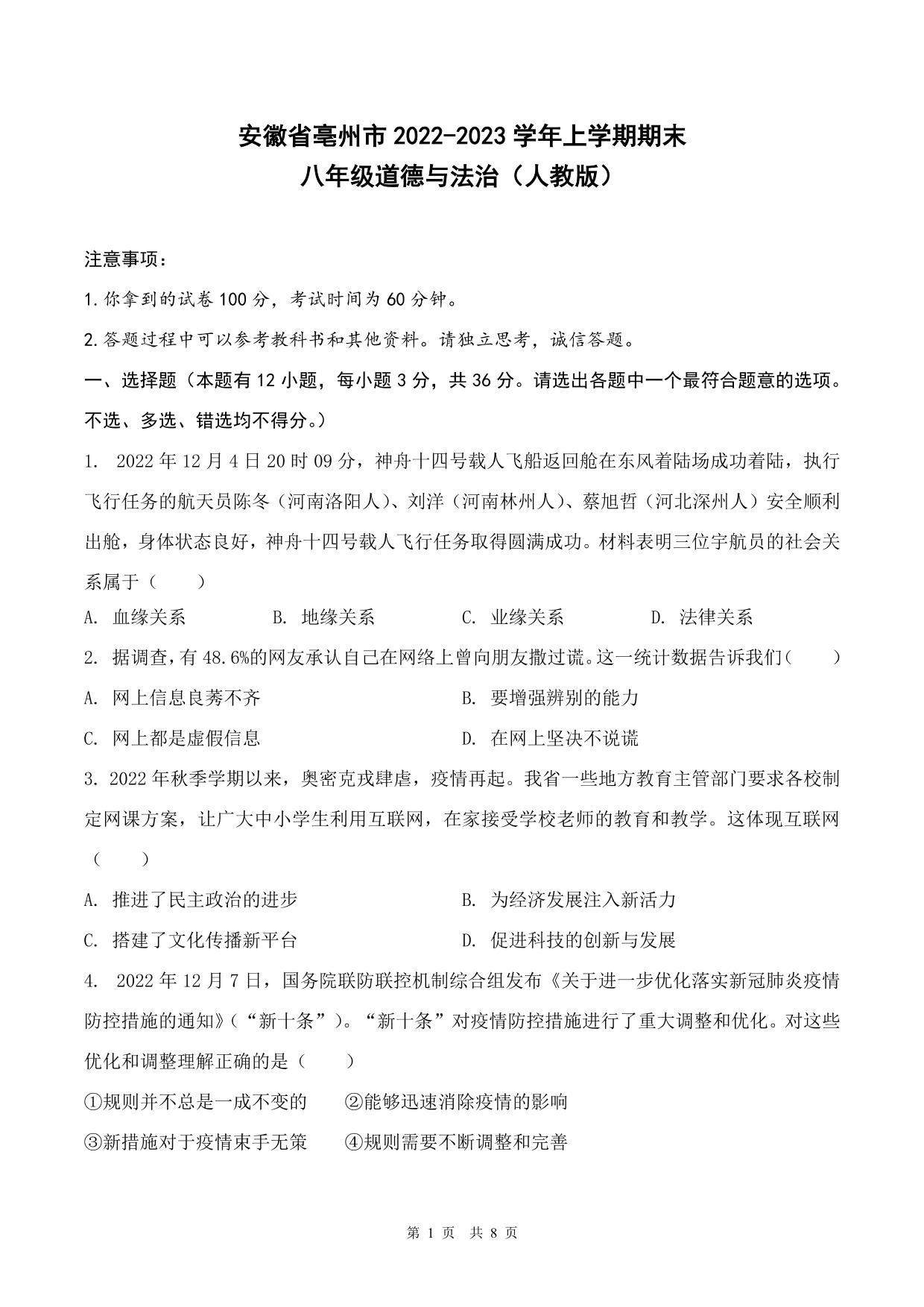 安徽省亳州市2022-2023学年上学期期末八年级道德与法治(人教版)