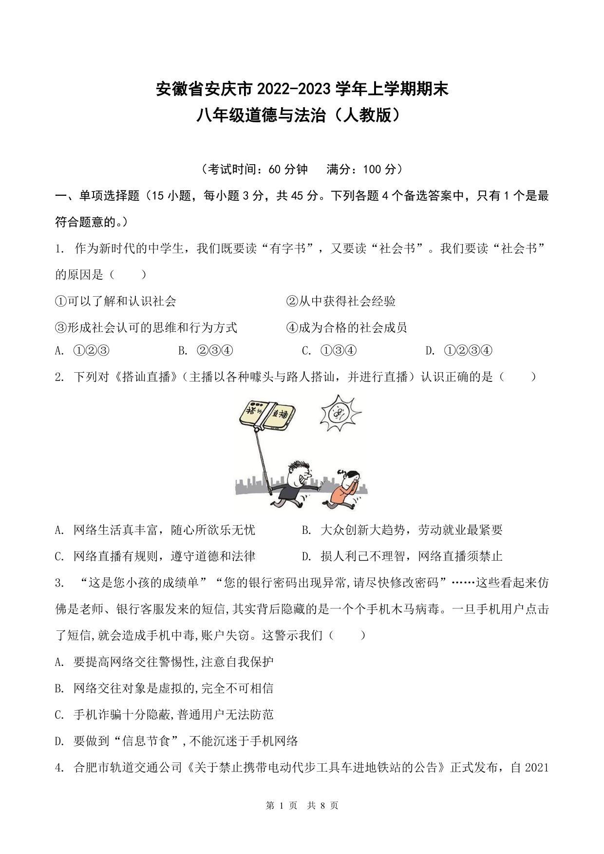 安徽省安庆市2022-2023学年上学期期末八年级道德与法治(人教版)