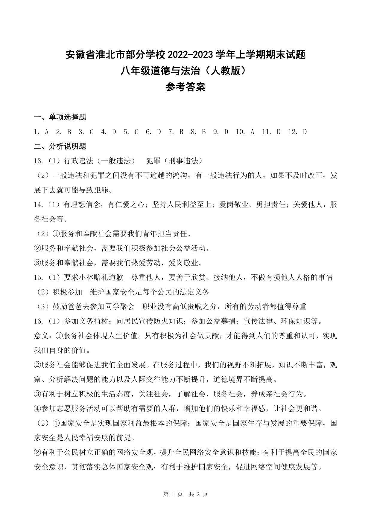 安徽省淮北市部分学校2022-2023学年上学期期末试题八年级道德与法治(人教版)