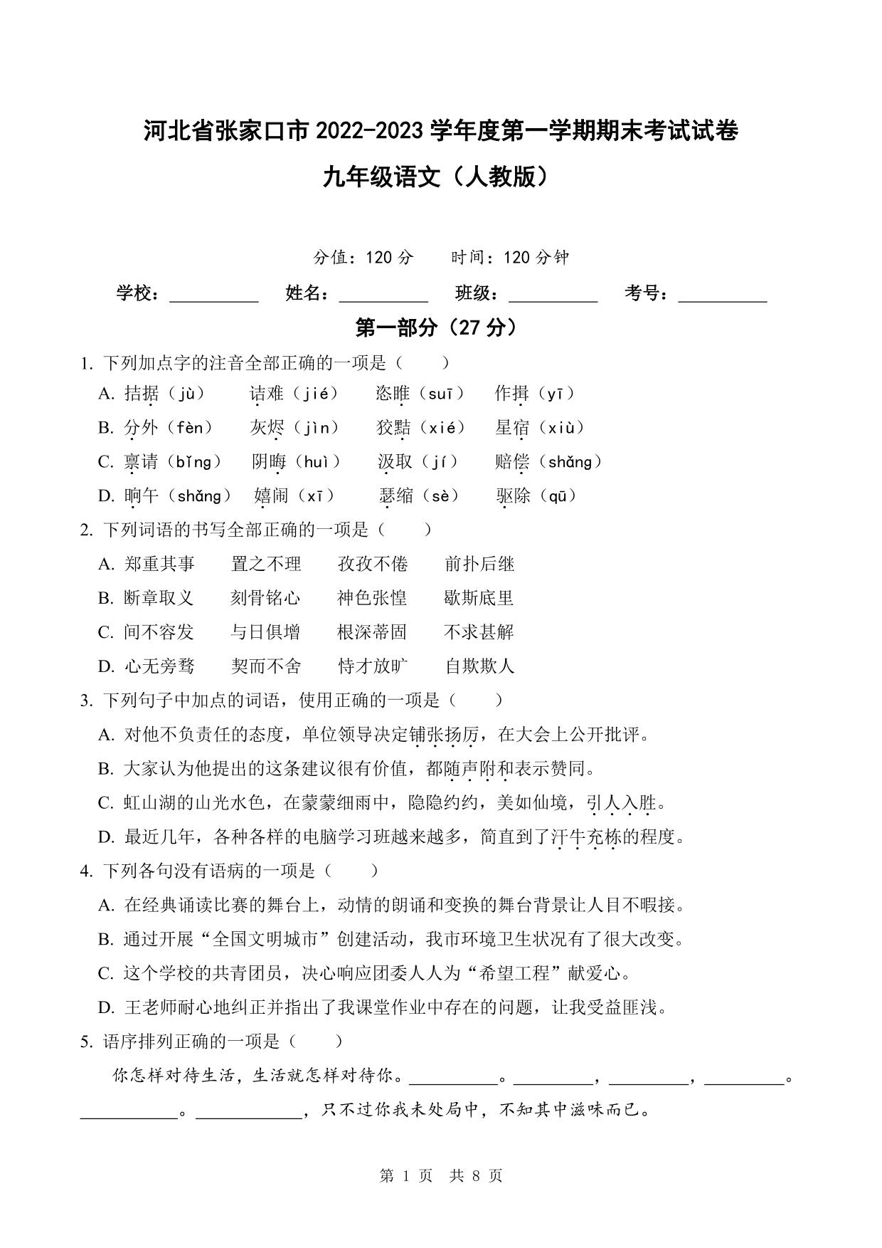 河北省张家口市2022-2023学年度第一学期期末考试试卷九年级语文(人教版)