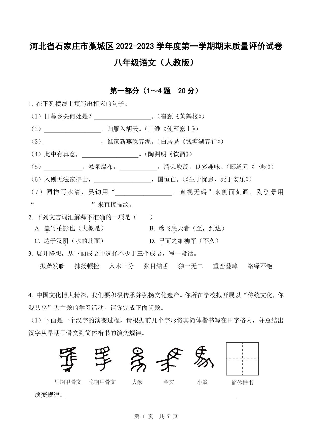 河北省石家庄市藁城区2022-2023学年度第一学期期末质量评价试卷八年级语文(人教版)