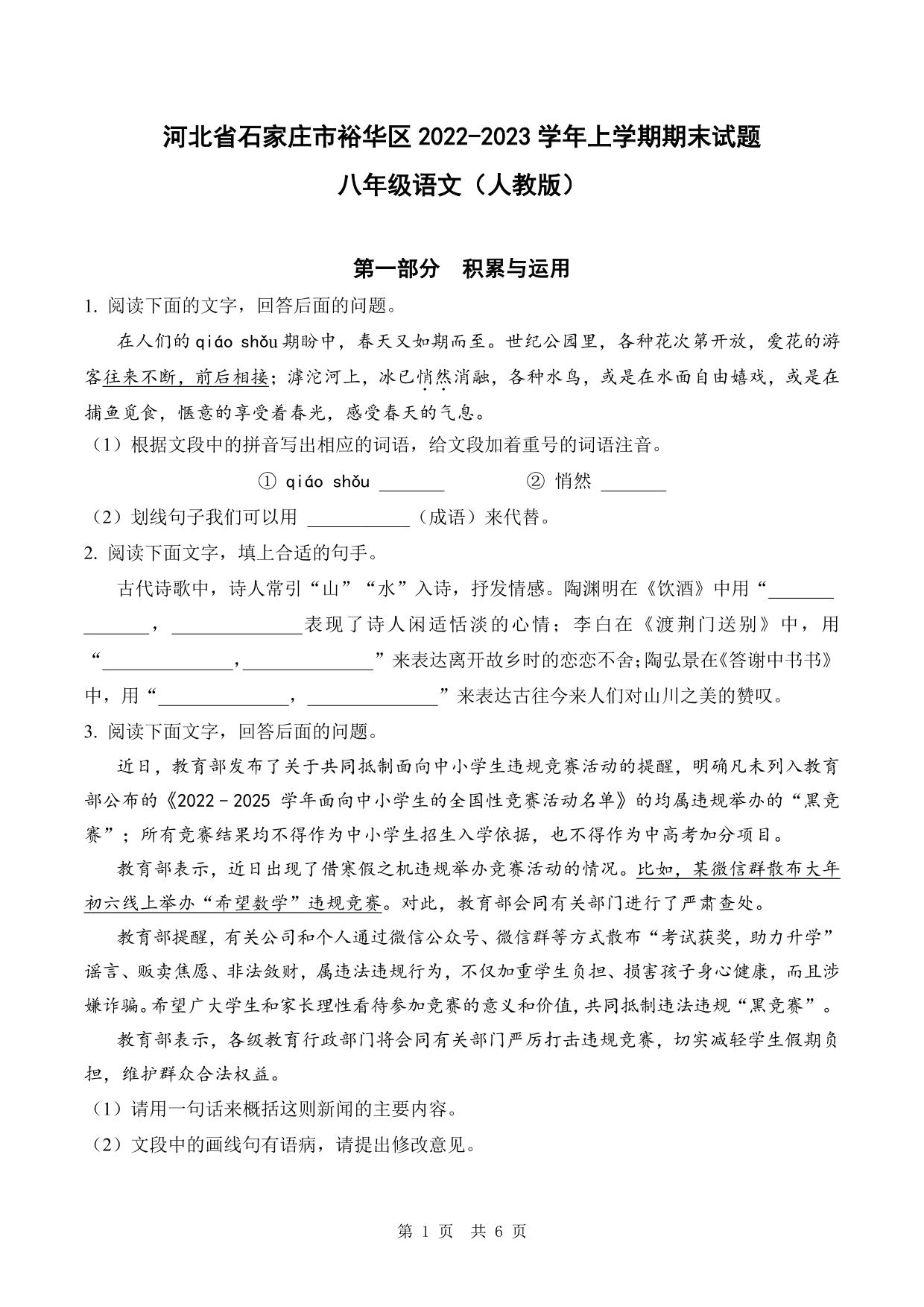 河北省石家庄市裕华区2022-2023学年上学期期末试题八年级语文(人教版)