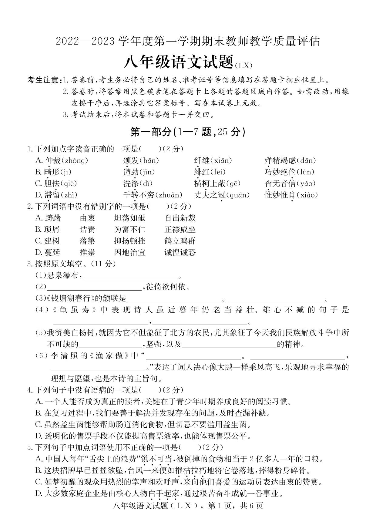 河北省保定市蠡县2022-2023学年度第一学期期末教师教学质量评估试题八年级语文(人教版)