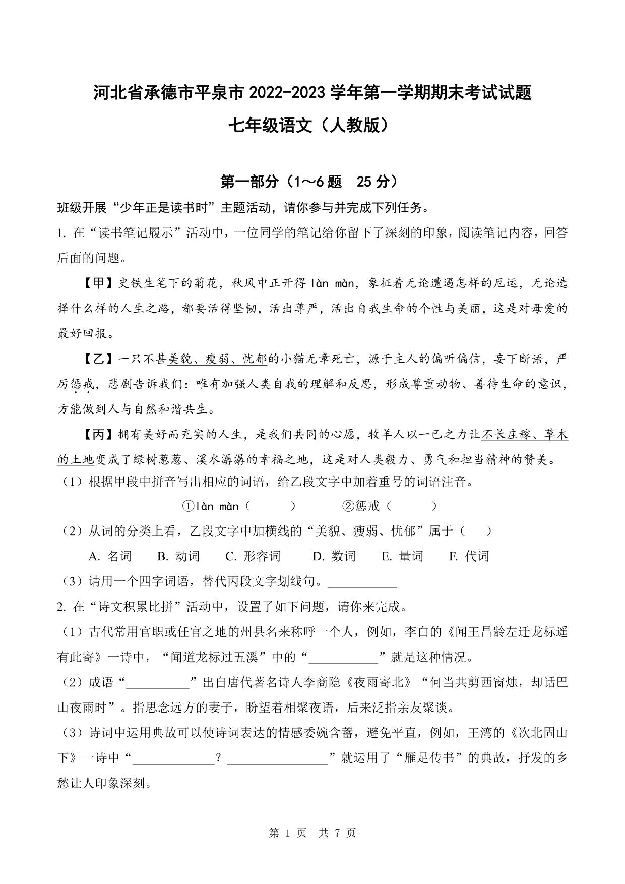 河北省承德市平泉市2022-2023学年第一学期期末考试试题七年级语文(人教版)