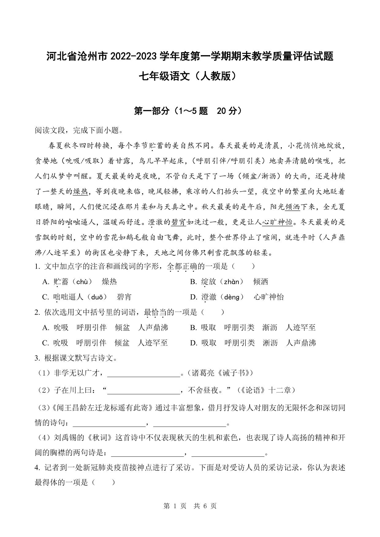 河北省沧州市2022-2023学年度第一学期期末教学质量评估试题七年级语文(人教版)