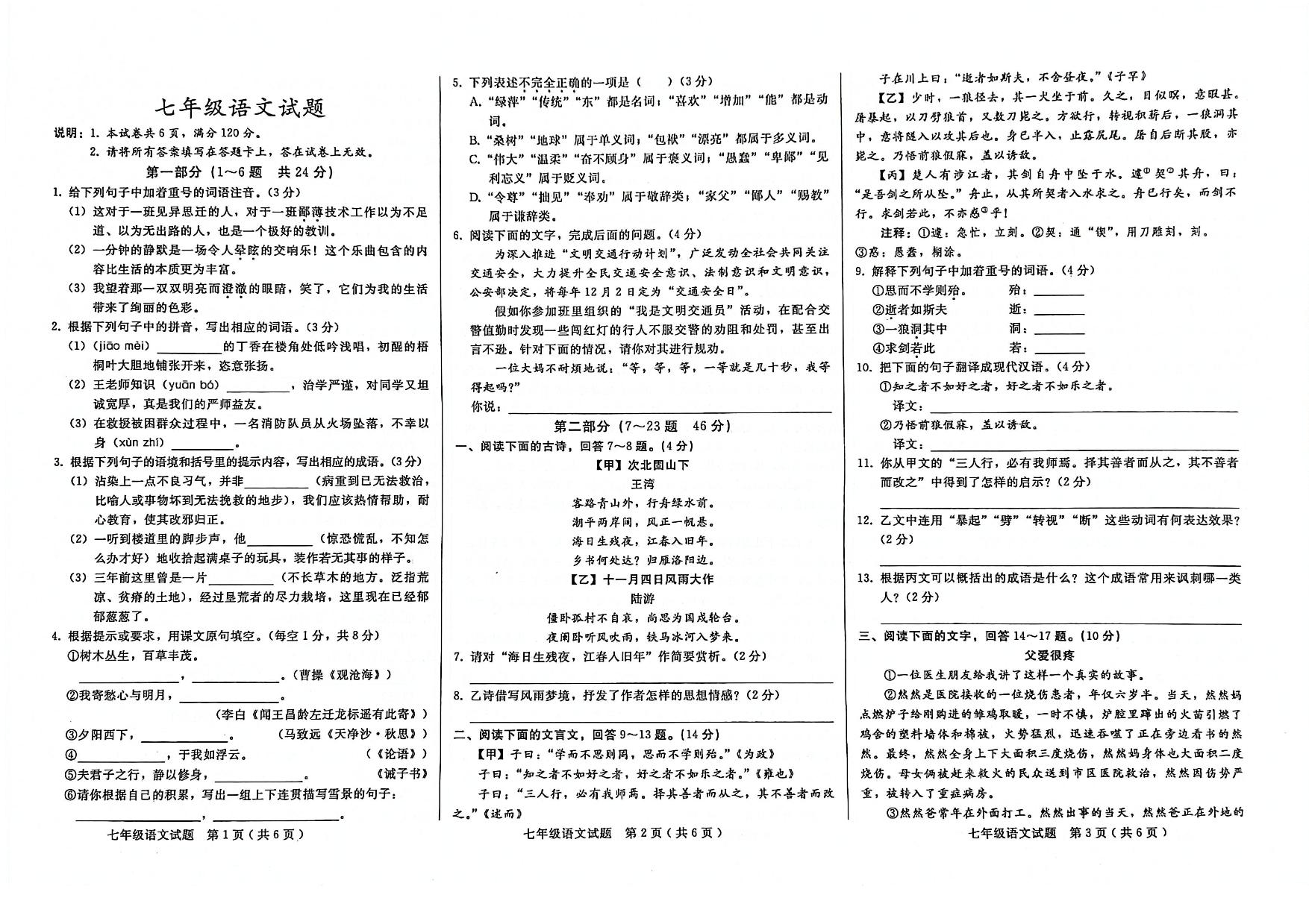 河北省邯郸市馆陶县2022-2023学年上学期期末考试试卷七年级语文(人教版)