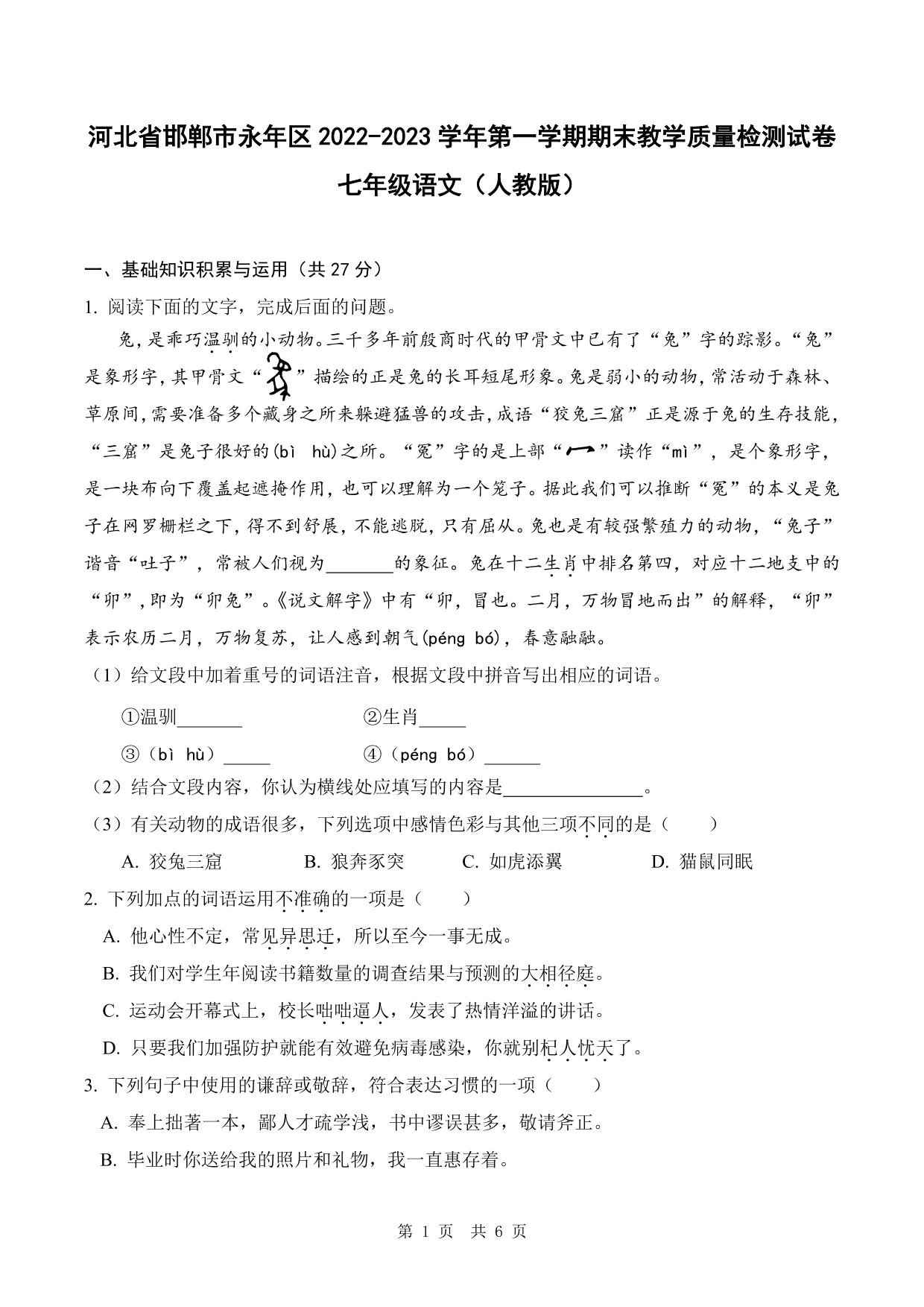 河北省邯郸市永年区2022-2023学年度第一学期期末教学质量检测试卷七年级语文(人教版)
