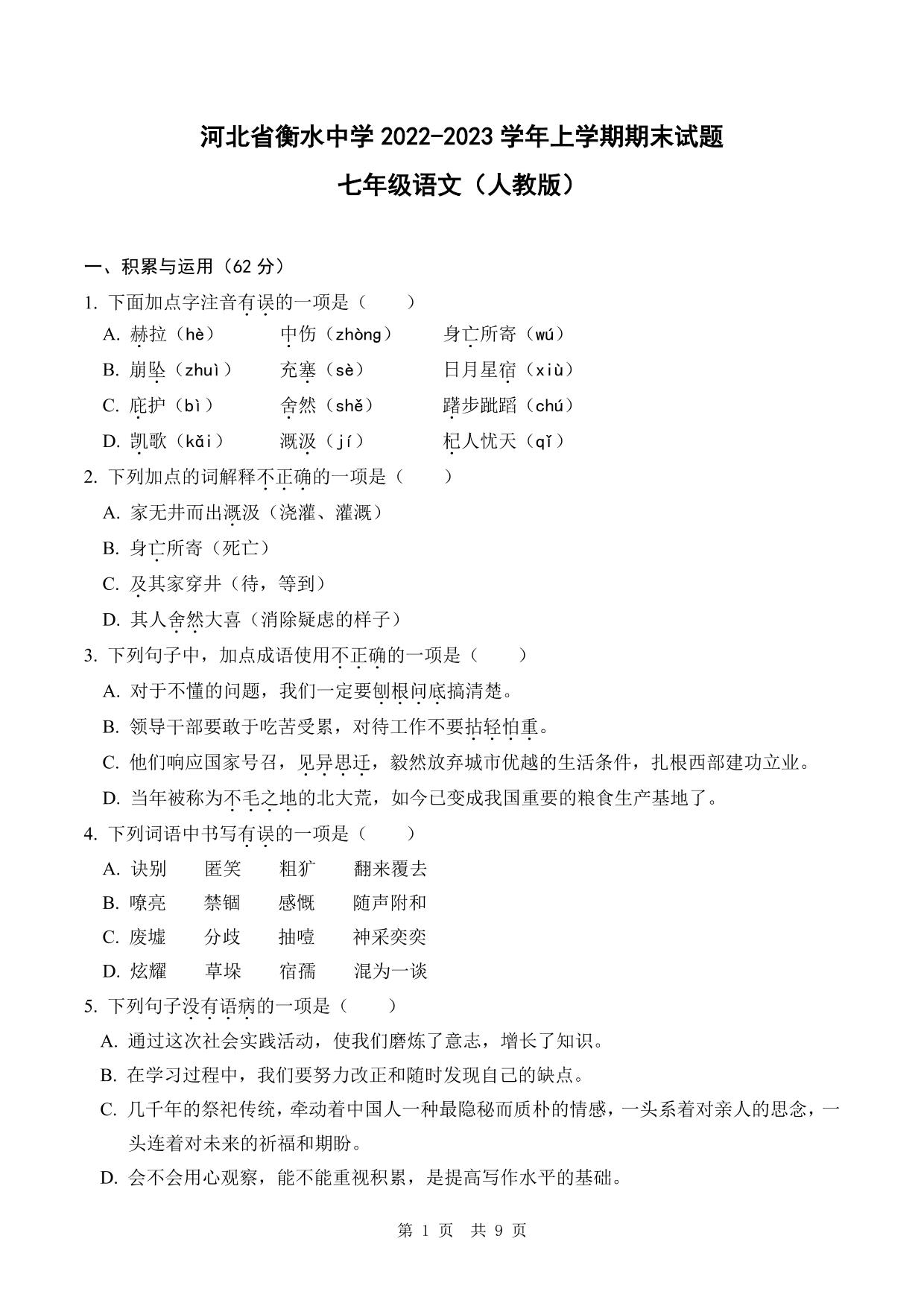 河北省衡水中学2022-2023学年上学期期末试题七年级语文(人教版)