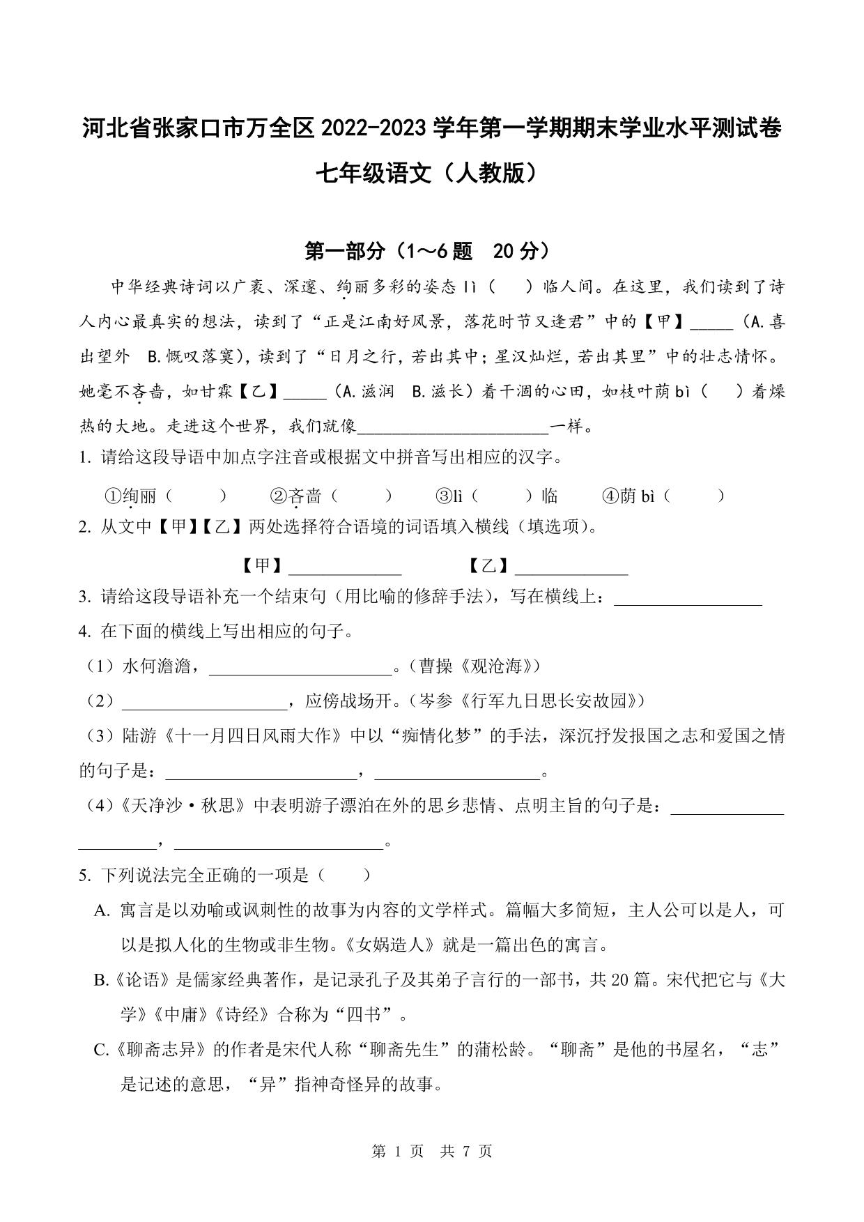 河北省张家口市万全区2022-2023学年度第一学期期末学业水平测试卷七年级语文(人教版)