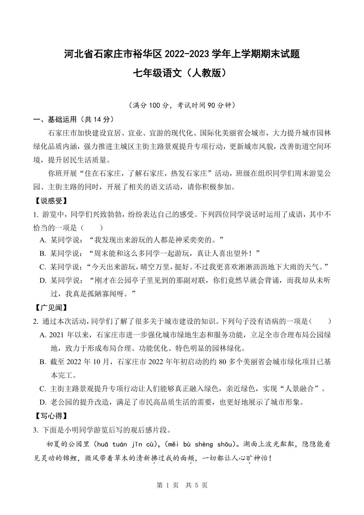 河北省石家庄市裕华区2022-2023学年上学期期末试题七年级语文(人教版)