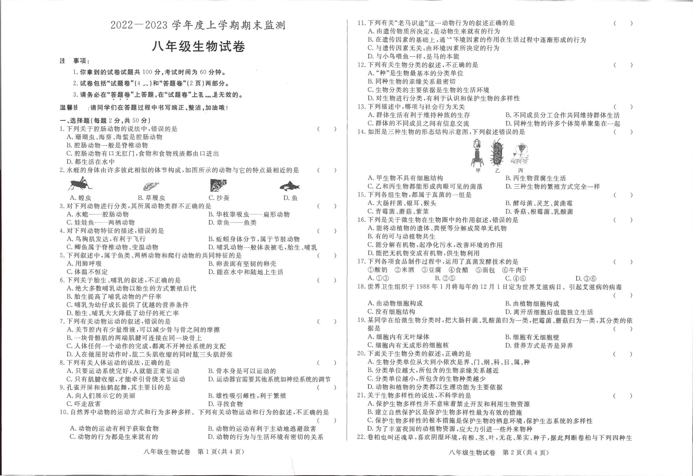 安徽省蚌埠市蚌山区2022-2023学年度上学期期末监测八年级生物(人教版)