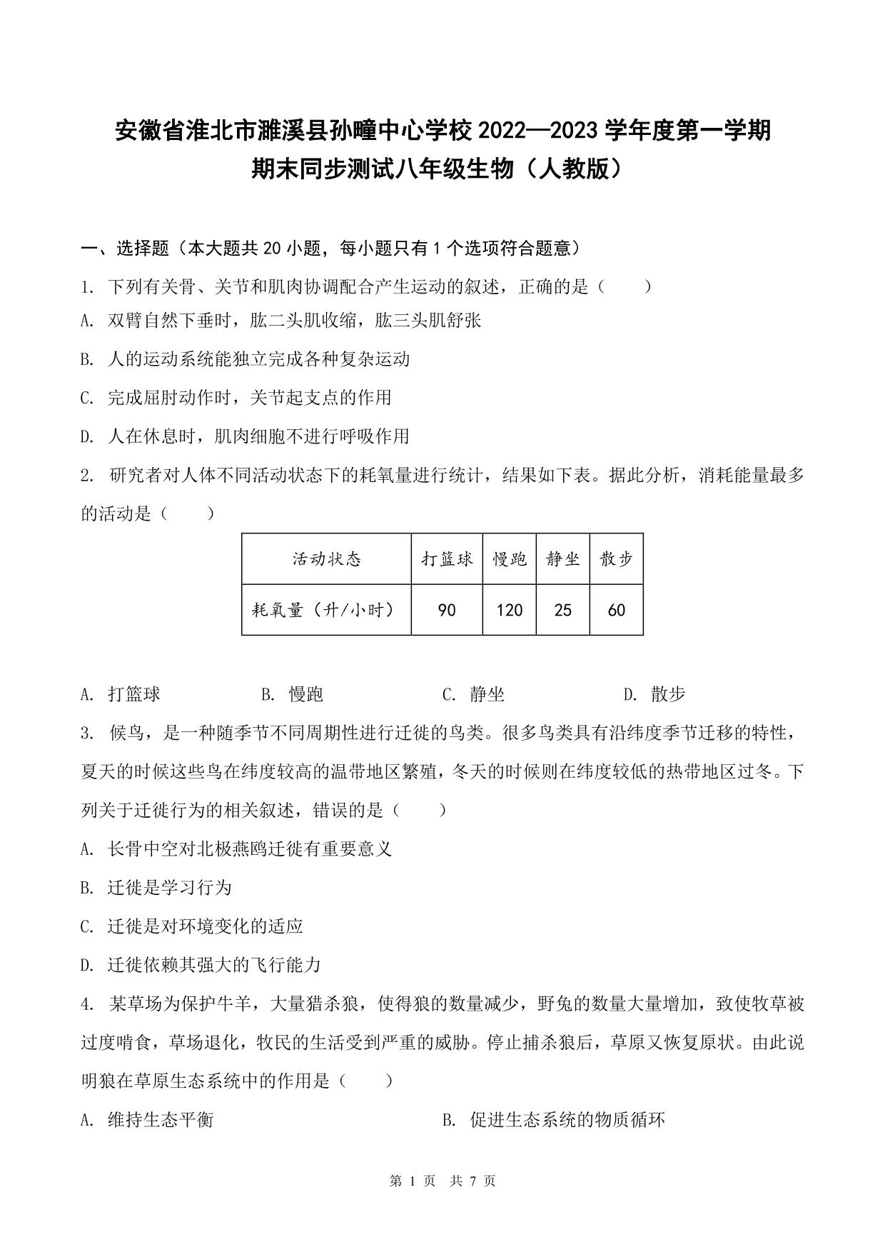 安徽省淮北市濉溪县孙疃中心学校2022-2023学年度第一学期期末同步测试八年级生物(人教版)