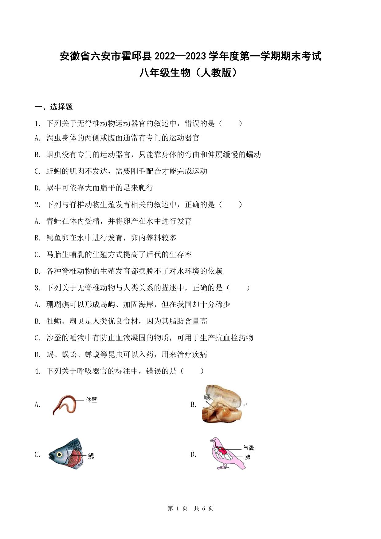 安徽省六安市霍邱县2022-2023学年度第一学期期末考试八年级生物(人教版)