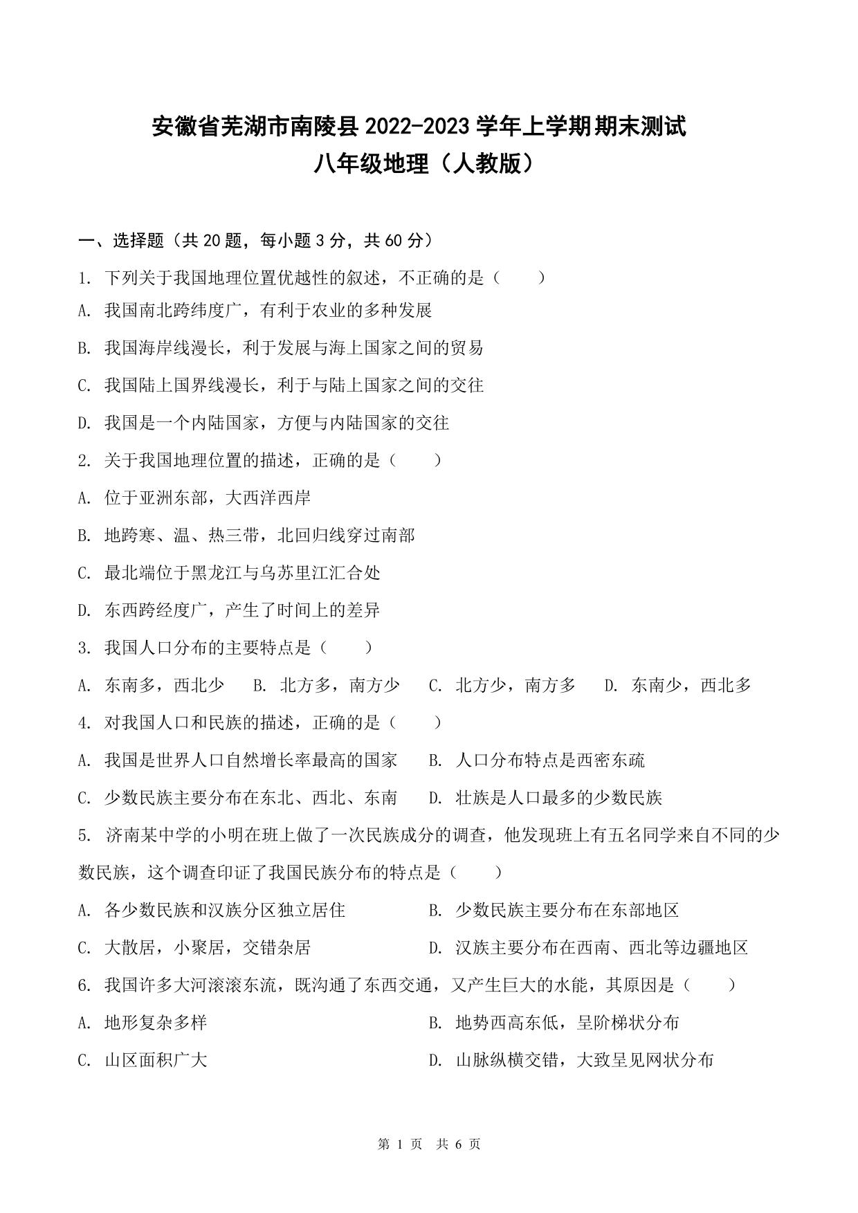 安徽省芜湖市南陵县2022-2023学年上学期期末测试八年级地理(人教版)