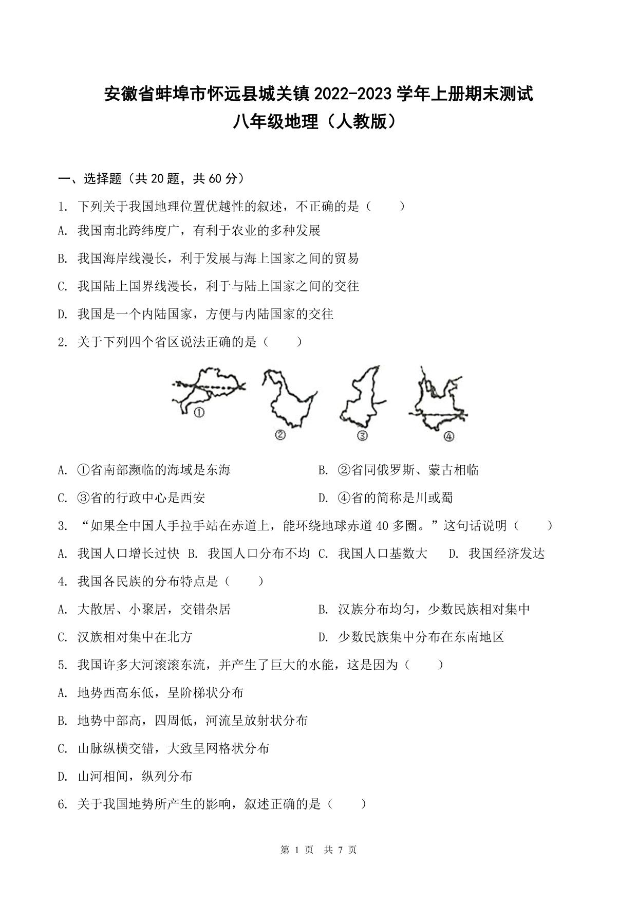 安徽省蚌埠市怀远县城关镇2022-2023学年上册期末测试八年级地理(人教版)