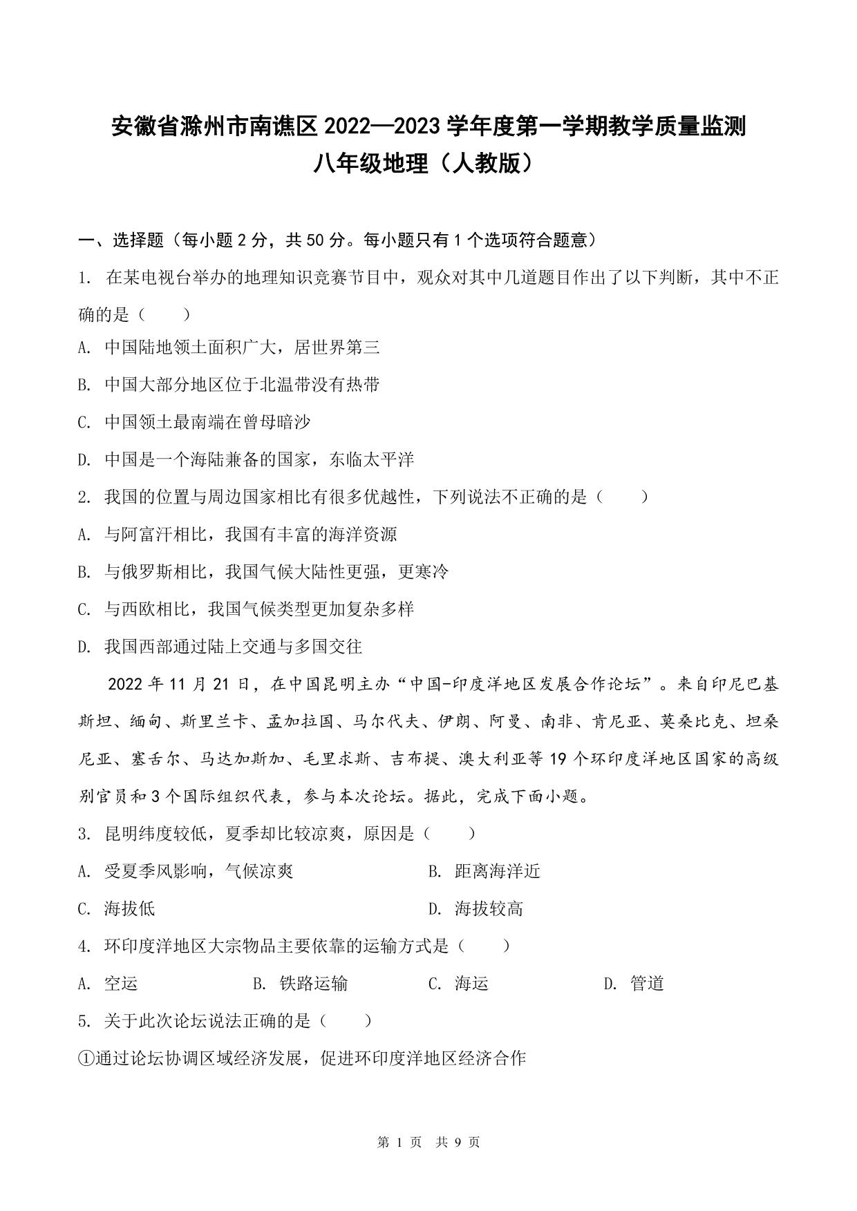 安徽省滁州市南谯区2022-2023学年度第一学期教学质量监测八年级地理(人教版)