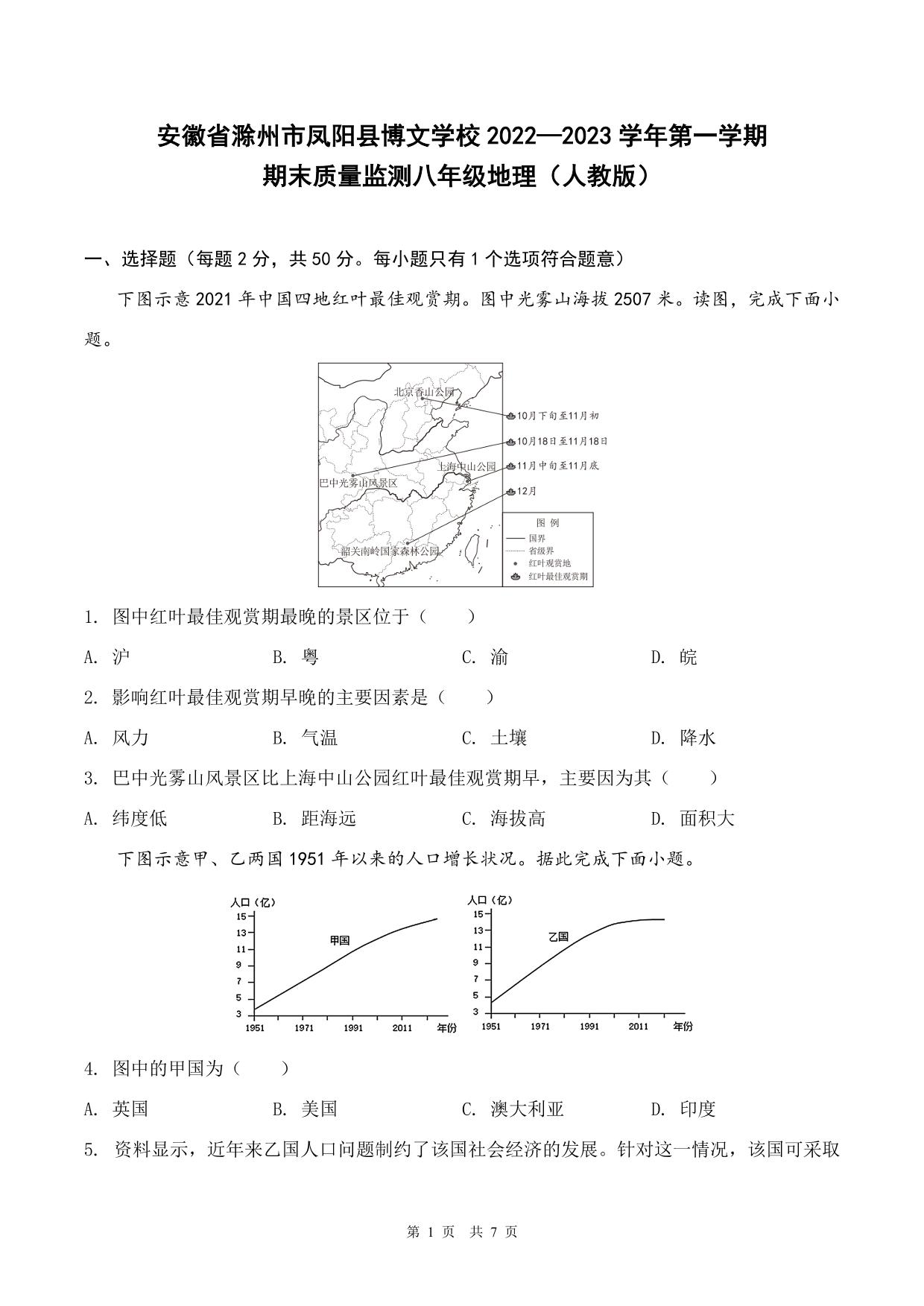 安徽省滁州市凤阳县博文学校2022-2023学年第一学期期末质量监测八年级地理(人教版)