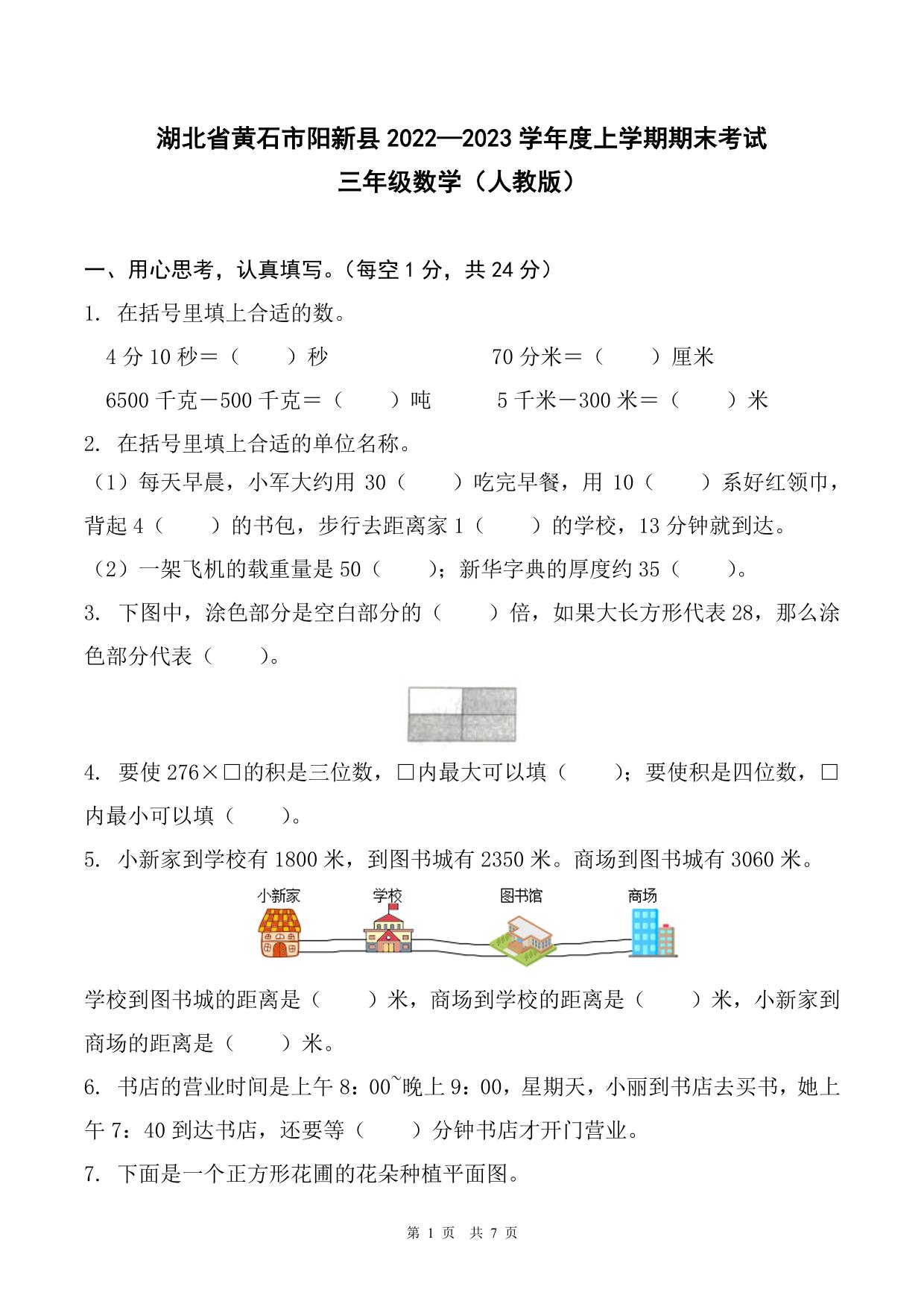 湖北省黄石市阳新县2022-2023学年度上学期期末考试三年级数学(人教版)