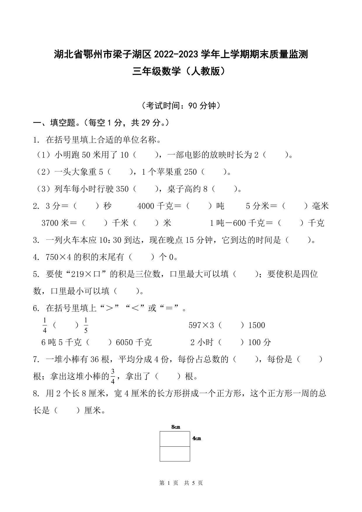 湖北省鄂州市梁子湖区2022-2023学年上学期期末质量监测三年级数学(人教版)