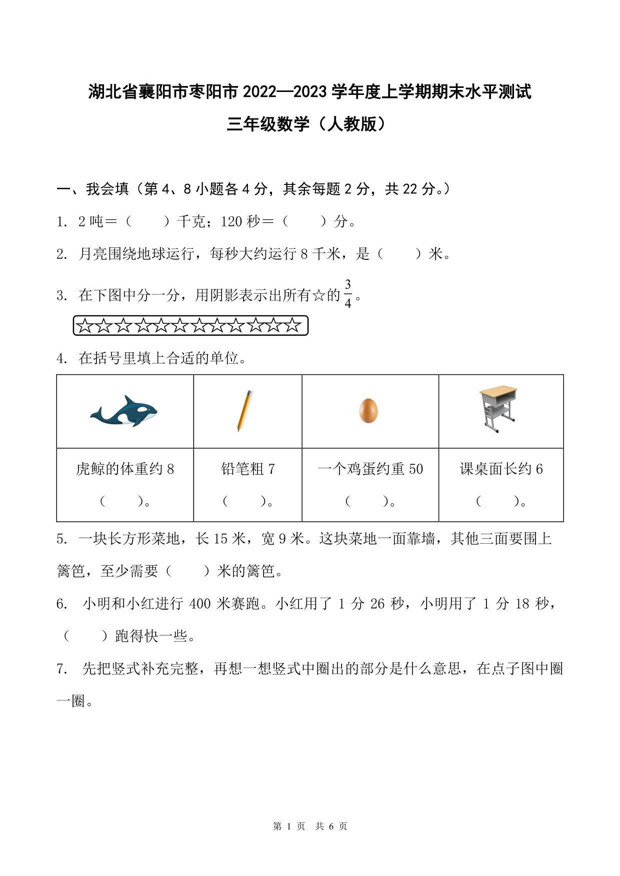 湖北省襄阳市枣阳市2022-2023学年度上学期期末水平测试三年级数学(人教版)