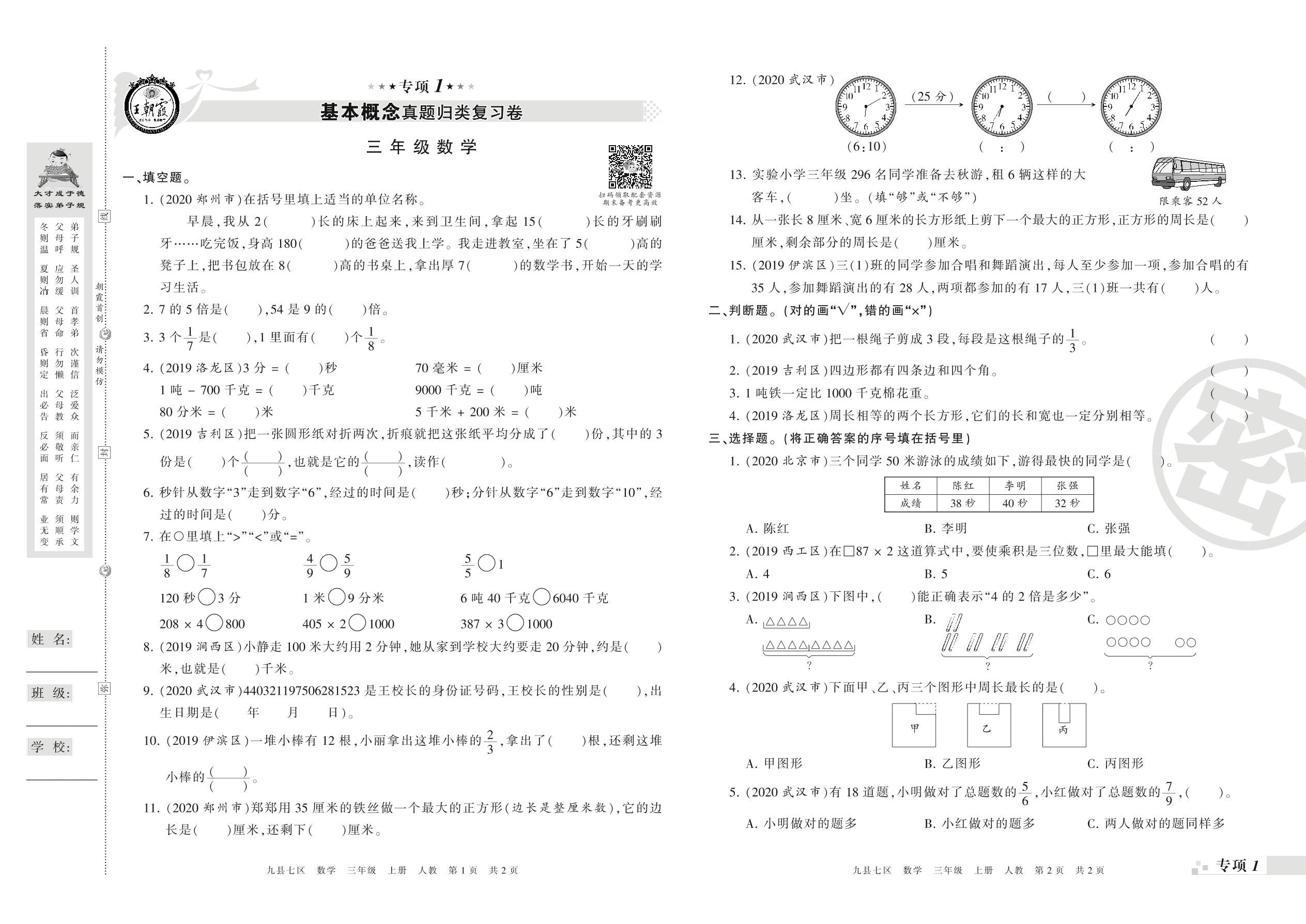 王朝霞期末专项卷——基本概念、计算真题归类复习三年级上册数学(人教版)_R21080492400【0】