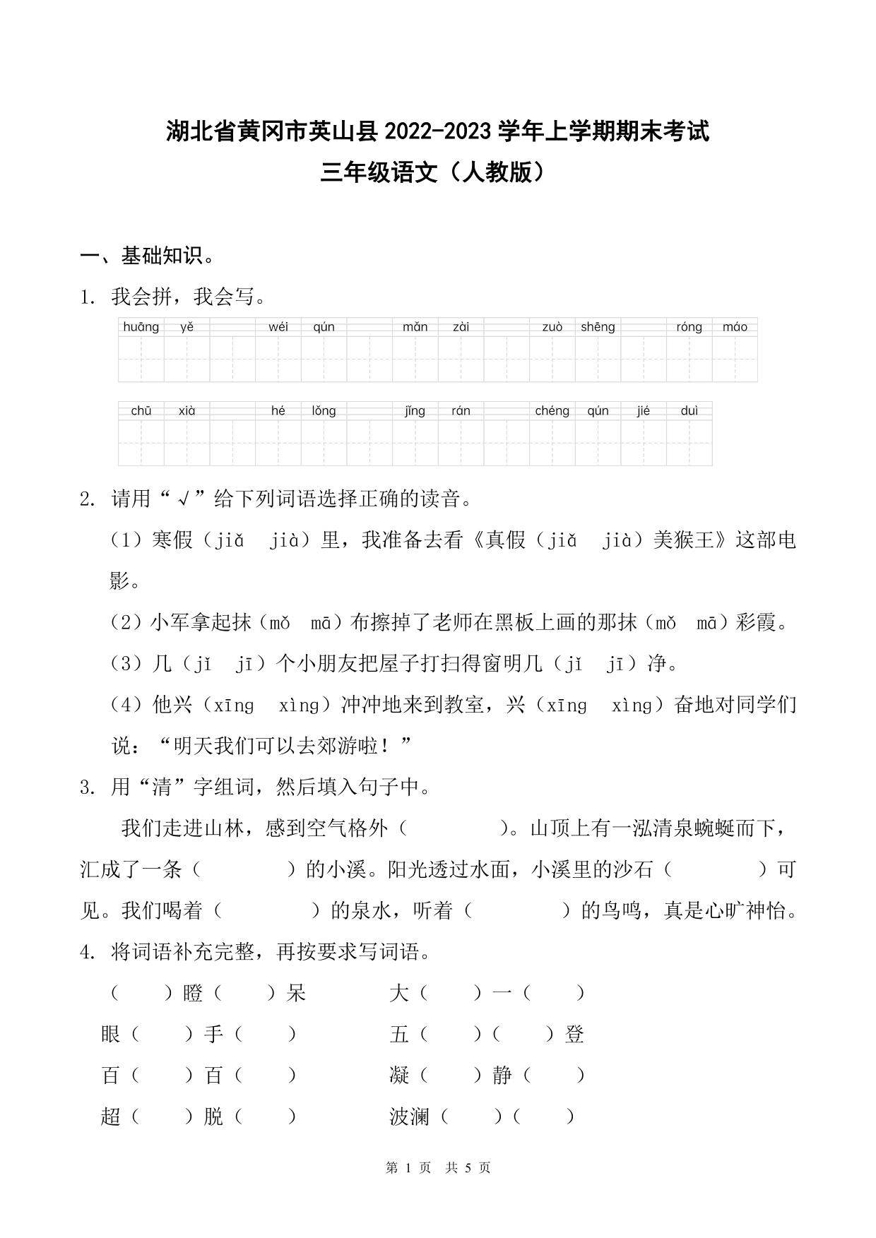 湖北省黄冈市英山县2022-2023学年上学期期末考试三年级语文(人教版)