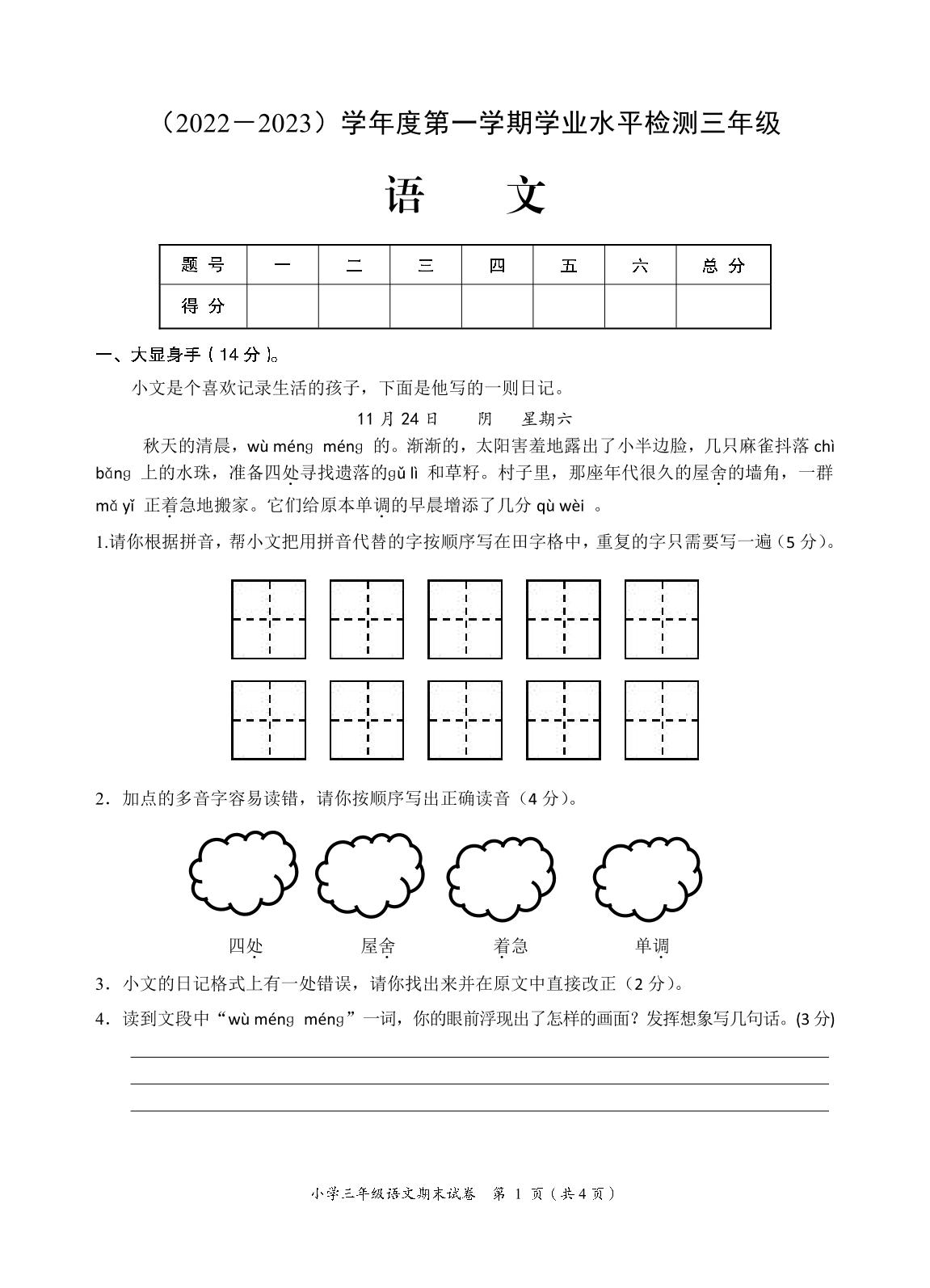 湖北省孝感市应城市2022-2023学年度第一学期学业水平检测三年级语文(人教版)