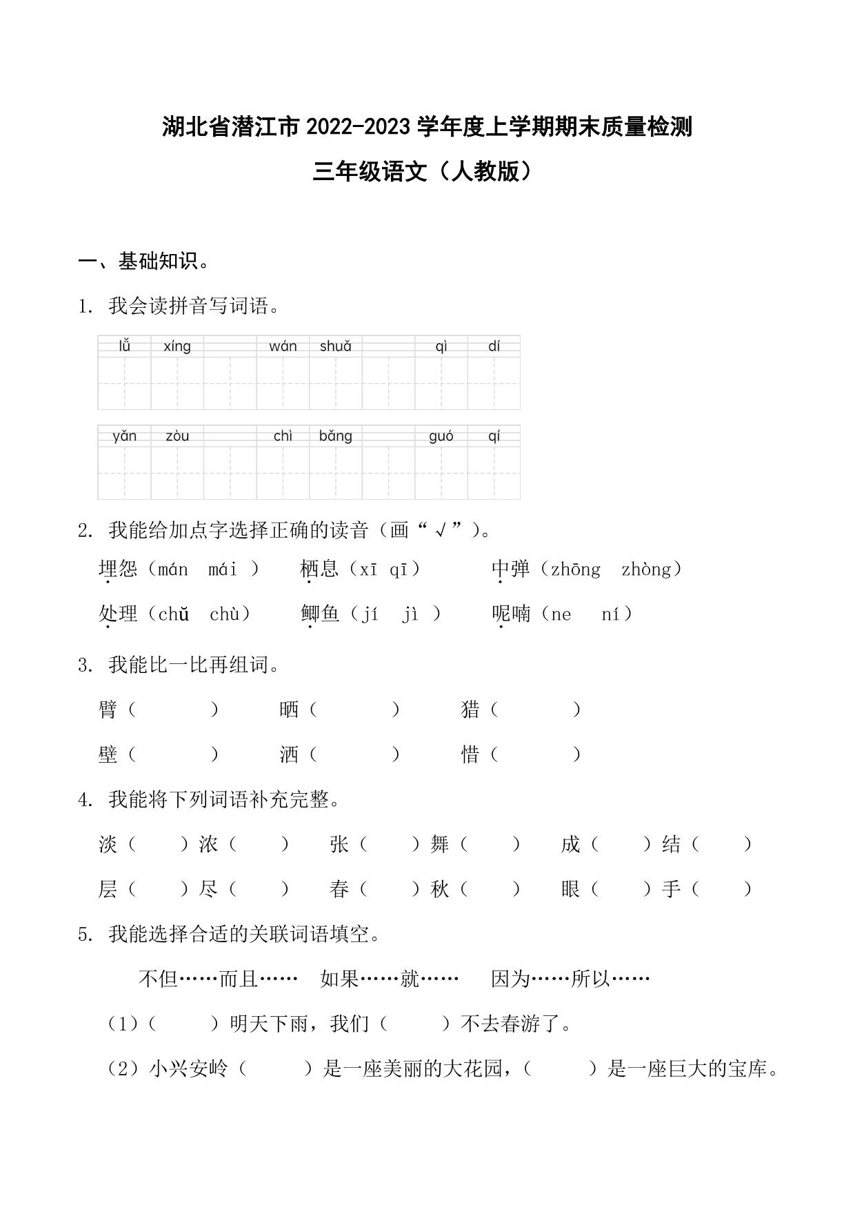 湖北省潜江市2022-2023学年度上学期期末质量检测三年级语文(人教版)