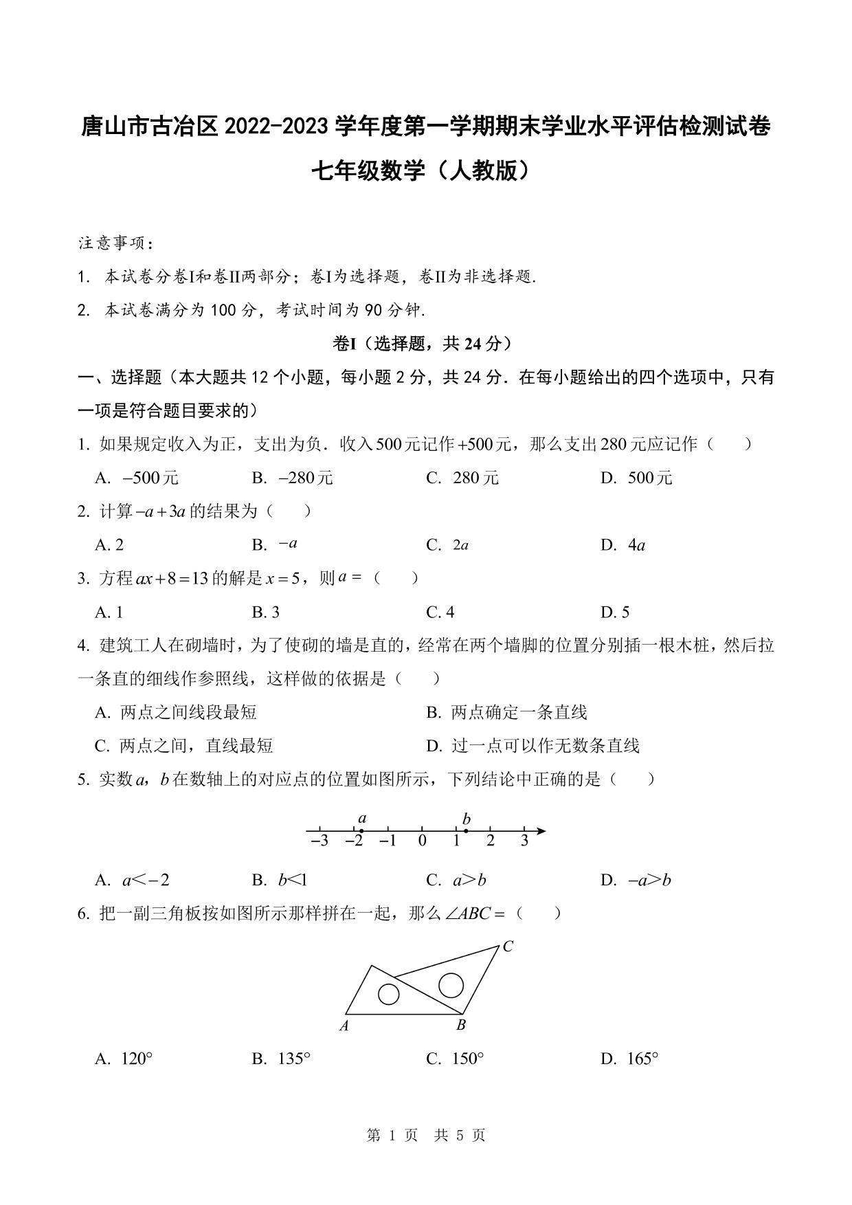 河北省唐山市古冶区2022-2023学年度第一学期期末学业水平评估检测试卷七年级数学(人教版)